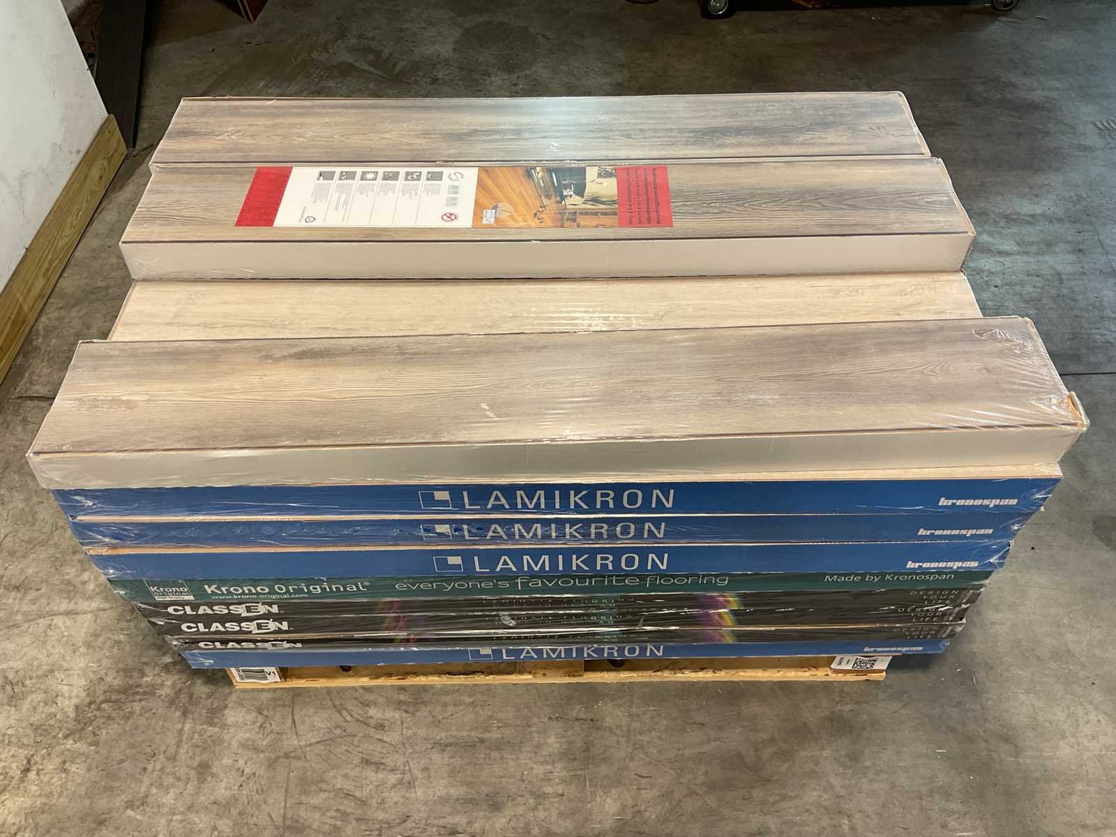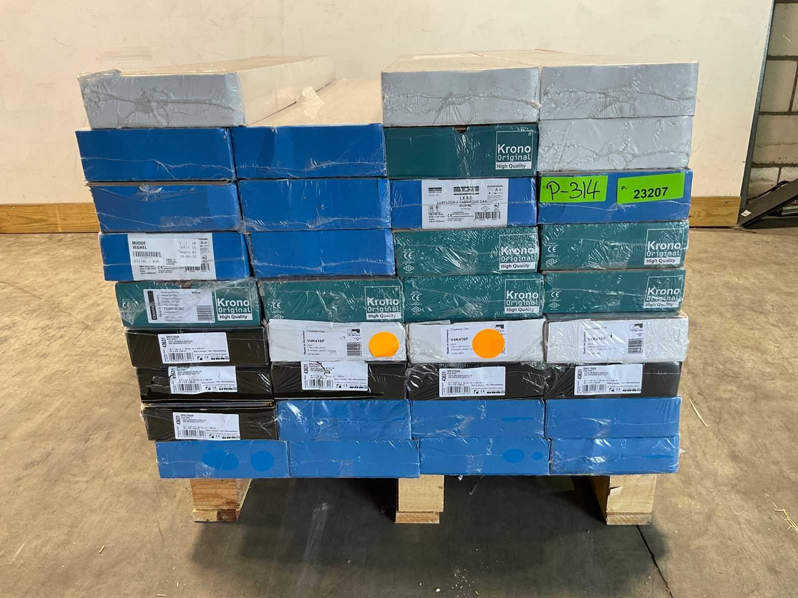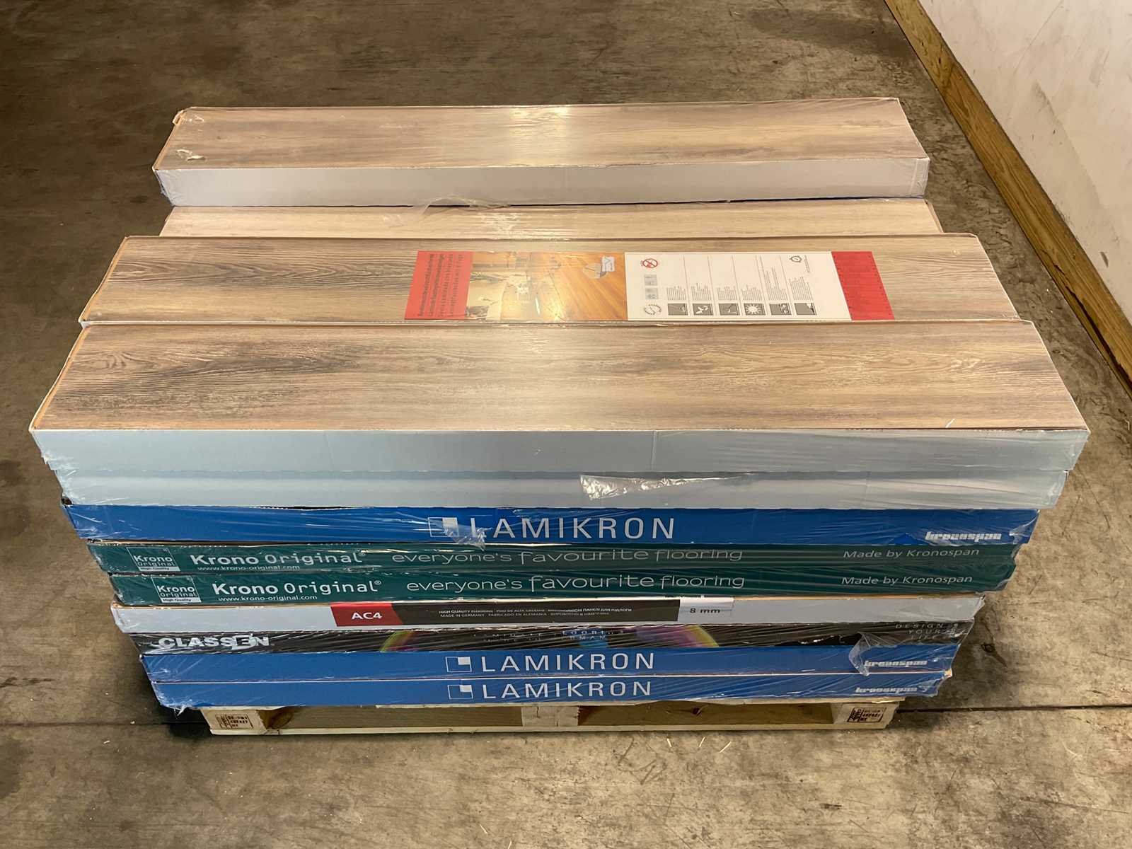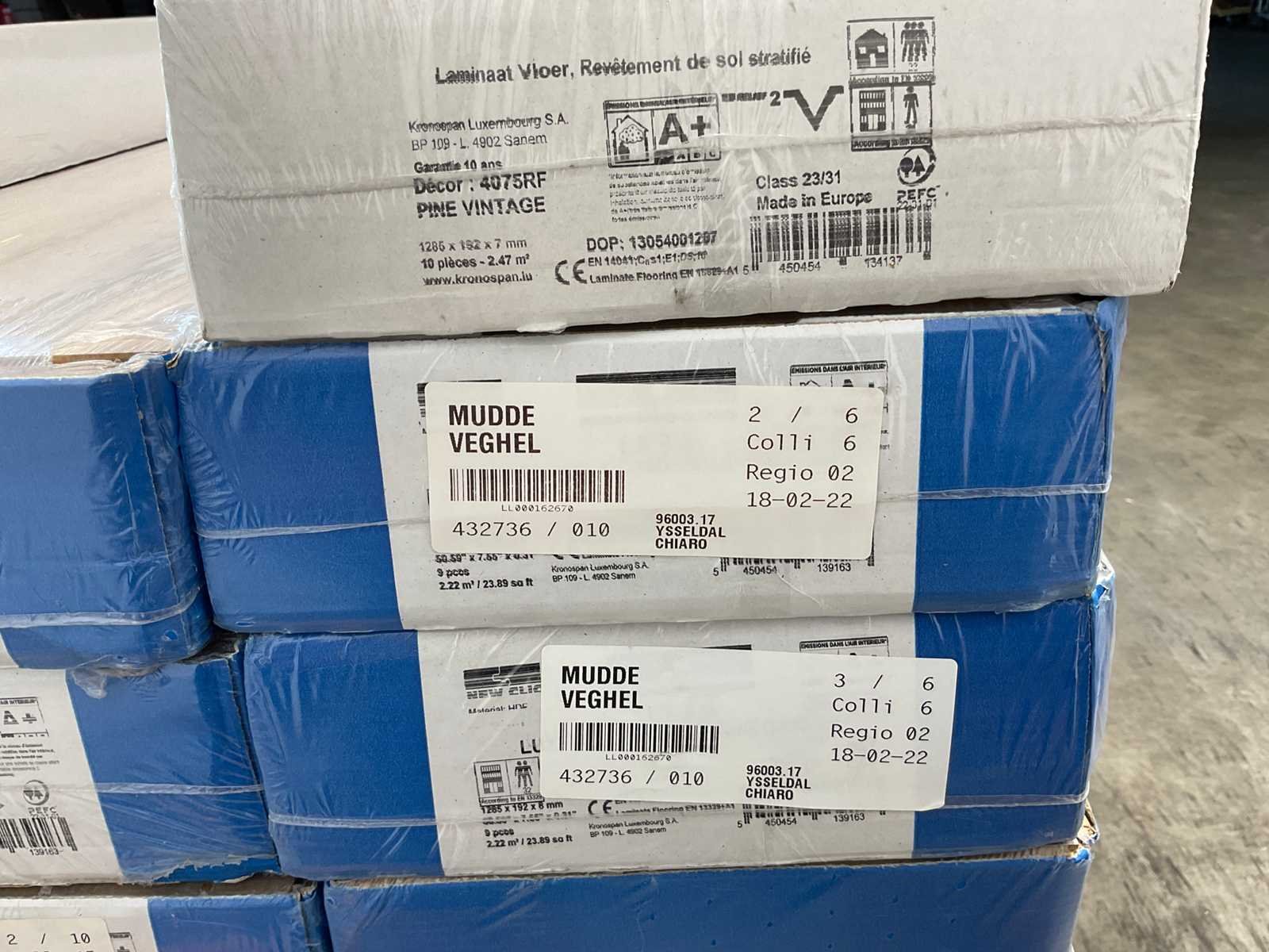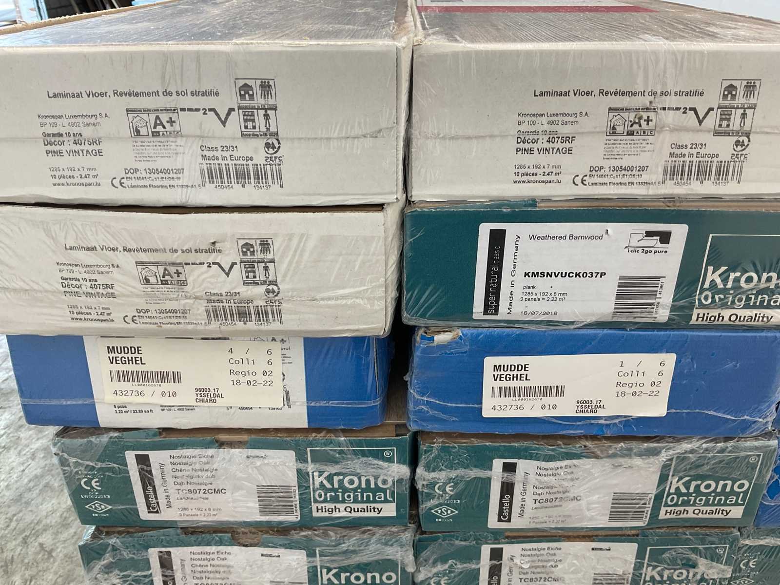 Mixpallet met diverse soorten laminaat – ongeveer 35 pakken, goed voor circa 77m². Bekijk de foto’s voor specificaties en details.