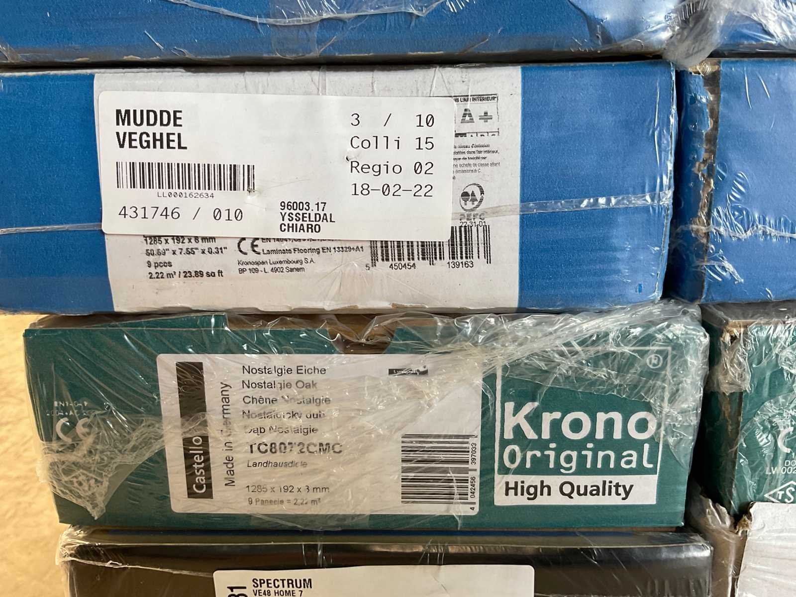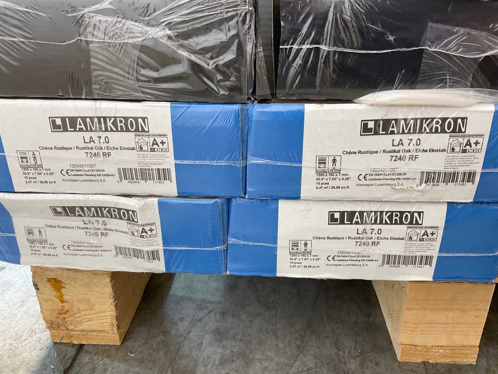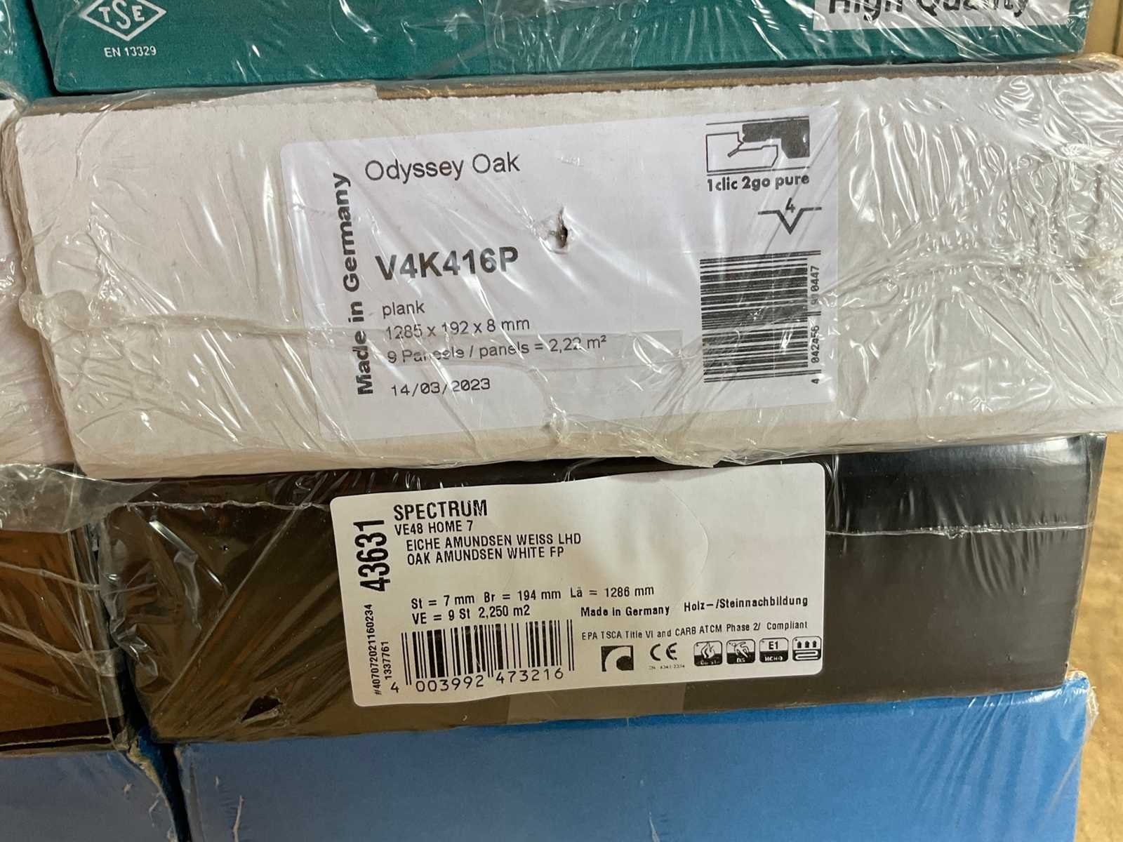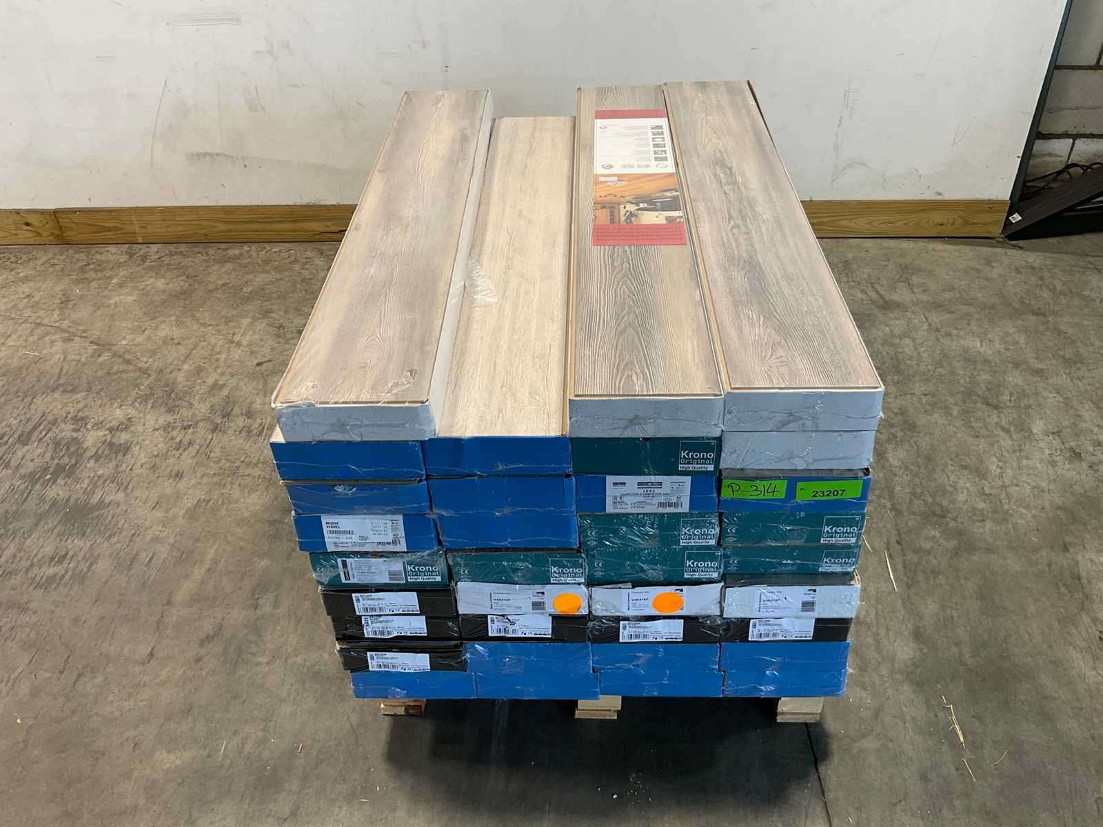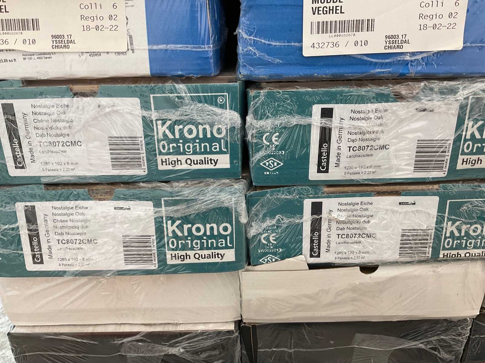 Mixpallet met diverse soorten laminaat – ongeveer 35 pakken, goed voor circa 77m². Bekijk de foto’s voor specificaties en details.