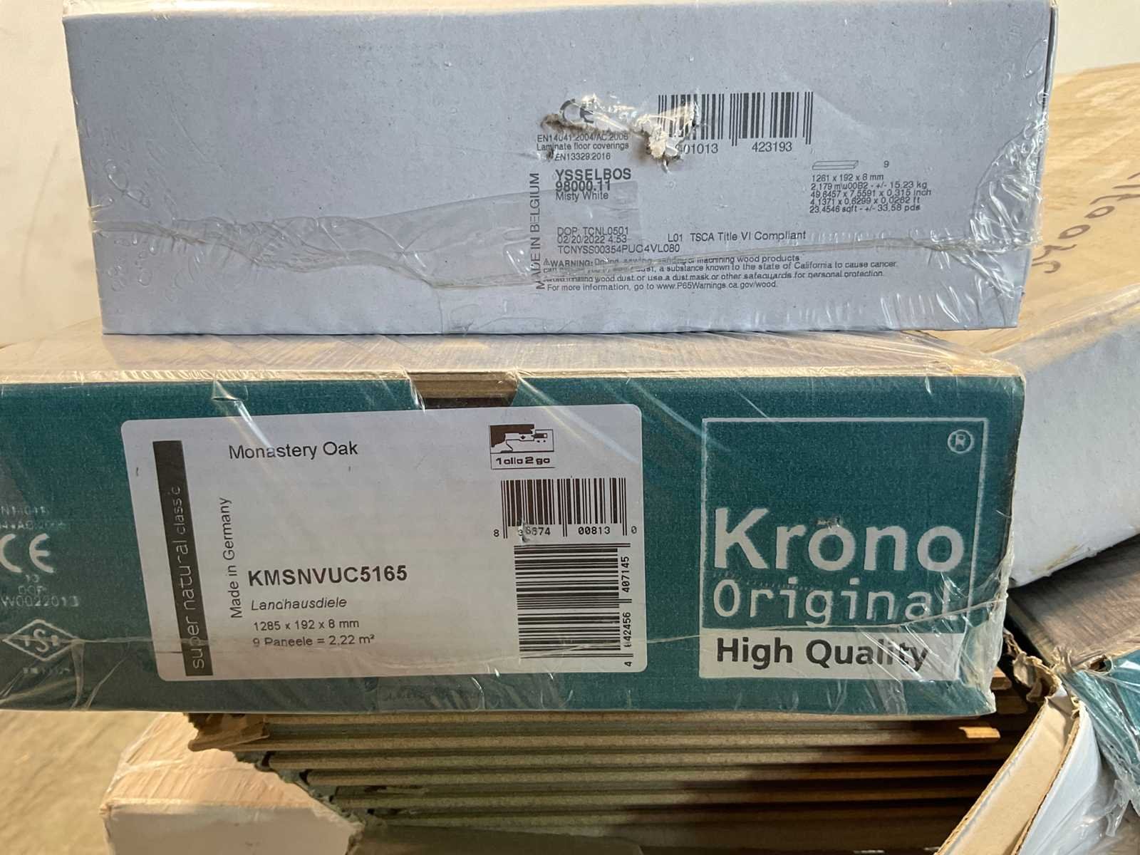 Mixpallet met diverse soorten laminaat – ongeveer 21 pakken, goed voor circa 46 m². Bekijk de foto’s voor specificaties en details.