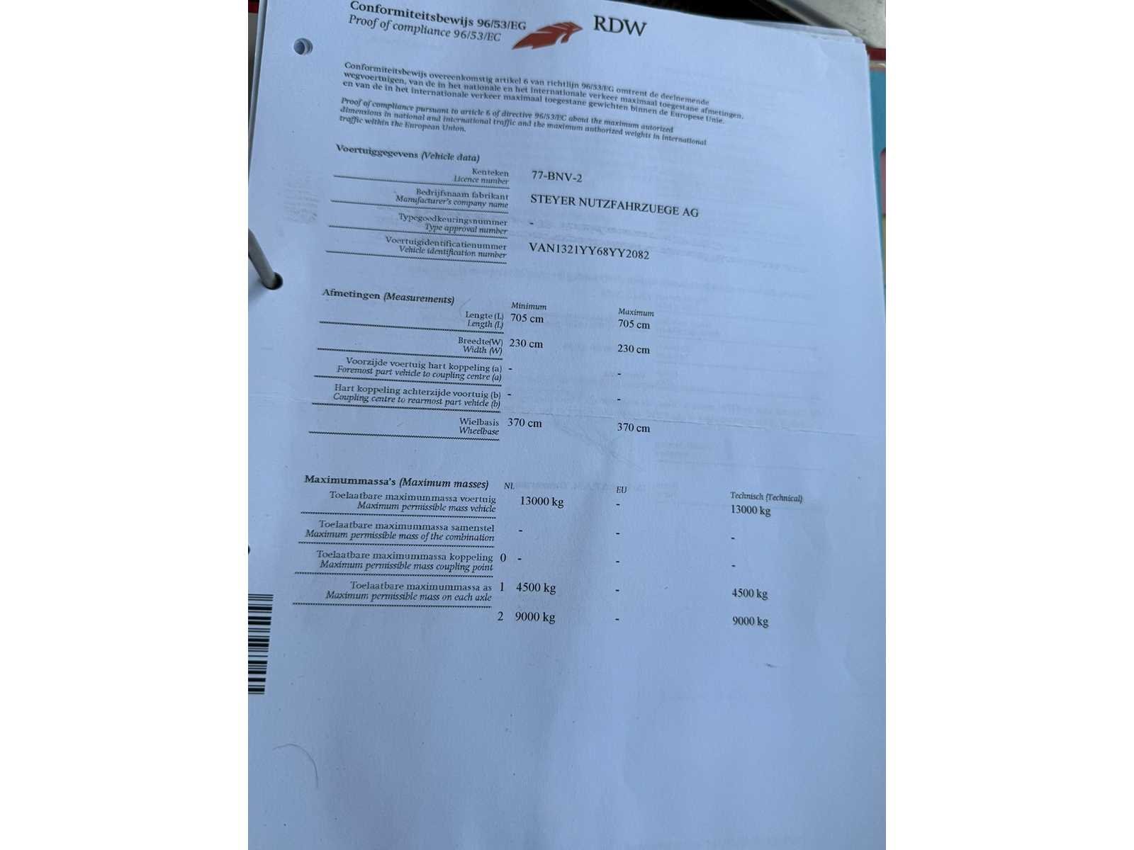 Let op: Kijkdag en ophaaldag alleen op afspraak! Let op: Objecten op verschillende locaties! Wij adviseren u gebruik te maken van de kijkdag, voor u eigen oordeel. Maak hiervoor een afspraak via info@sbservicetrucks.com! Kenteken: 77BNV2 Merk: Steyr Type: 13S26 4X4 Cilinderinhoud: 6592cc Kilometerstand bij opname: 61851km APK vervaldatum: 2025-01-08 Datum eerste toelating: 1996-10-02 Datum eerste toelating (NL): 2019-10-11 Fuel Type: diesel Laadvermogen: 4350kg Emissieklasse: 2 Aantal zitplaatsen: 3