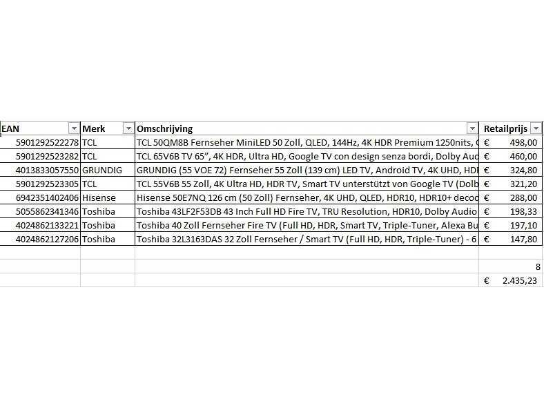 Dit betreft een partij televisies retourgoederen van een grote online retailer. De partij bestaat uit diverse diverse maten televisies. Aantal stuks: 8. Retailwaarde: €2.435,- De televisies zijn niet werkend en zijn te gebruiken voor onderdelen. Kom op de kijkdag om te om zo een goed beeld te krijgen van de reden van retour. Zie foto's voor lijst met inhoud. Merk: Pallet