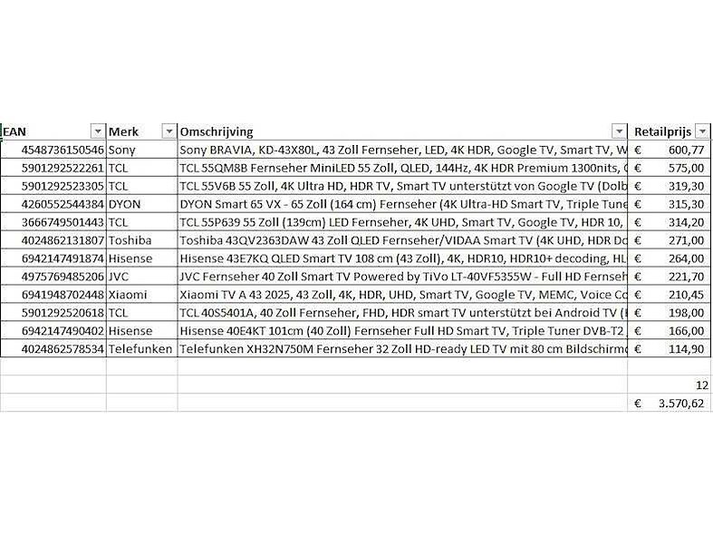 Dit betreft een partij televisies retourgoederen van een grote online retailer. De partij bestaat uit diverse diverse maten televisies. Aantal stuks: 12. Retailwaarde: €3.570,- De televisies zijn niet werkend en zijn te gebruiken voor onderdelen. Kom op de kijkdag om te om zo een goed beeld te krijgen van de reden van retour. Zie foto's voor lijst met inhoud. Merk: Pallet
