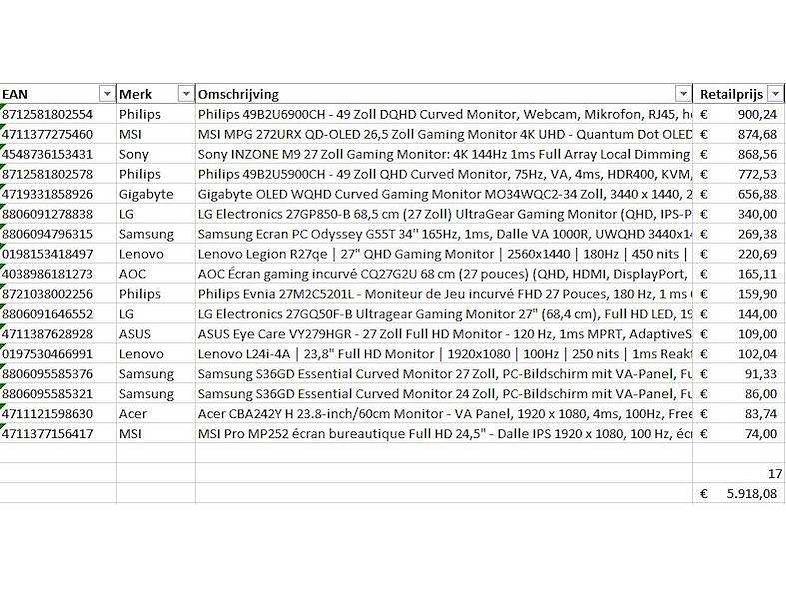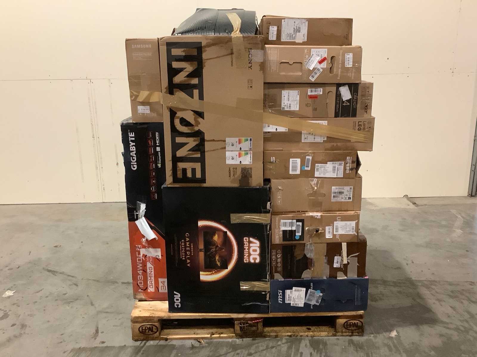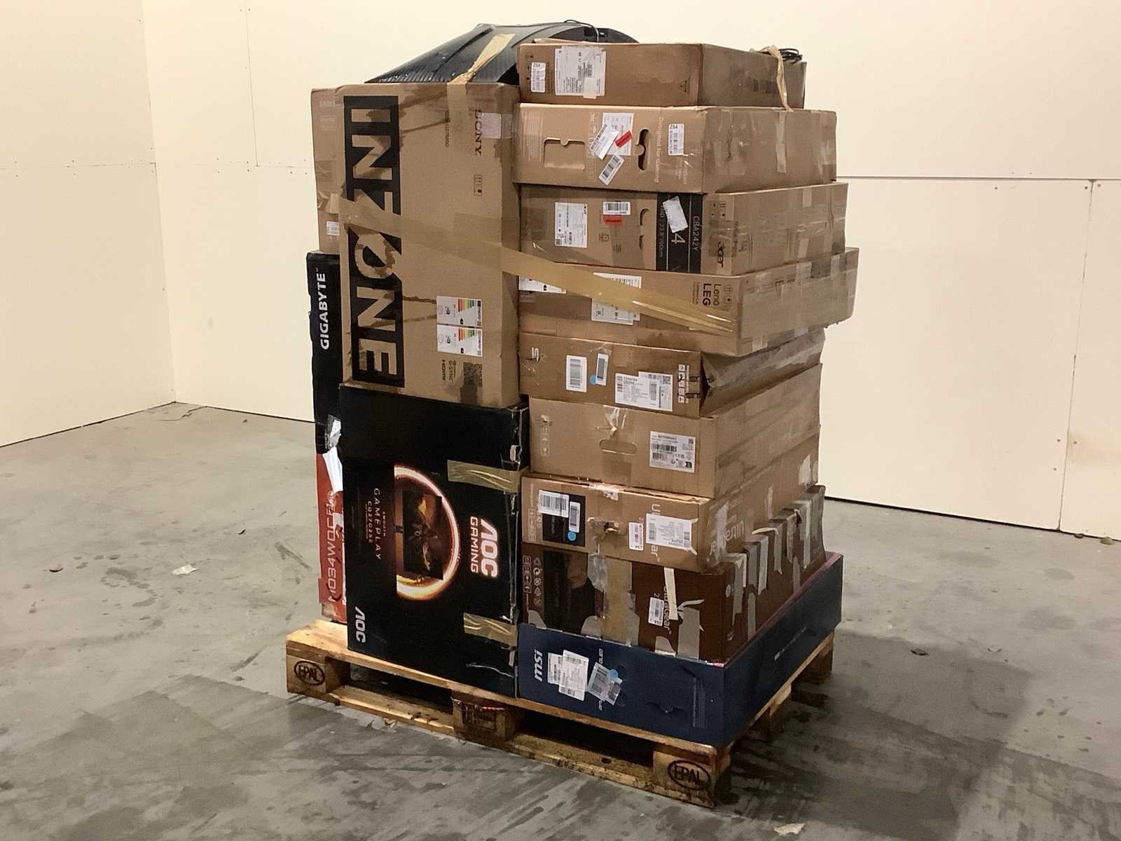 Dit betreft een partij PC Schermen / Monitors retourgoederen van een grote online retailer. De partij bestaat uit diverse diverse maten PC Schermen / Monitors. Aantal stuks: 17. Retailwaarde: €5918,- De PC chermen / Monitors zijn niet werkend en zijn te gebruiken voor onderdelen. Kom op de kijkdag om te om zo een goed beeld te krijgen van de reden van retour. Zie foto's voor lijst met inhoud. Within 14 days Merk: Pallet Retourgoederen - PC / Monitors