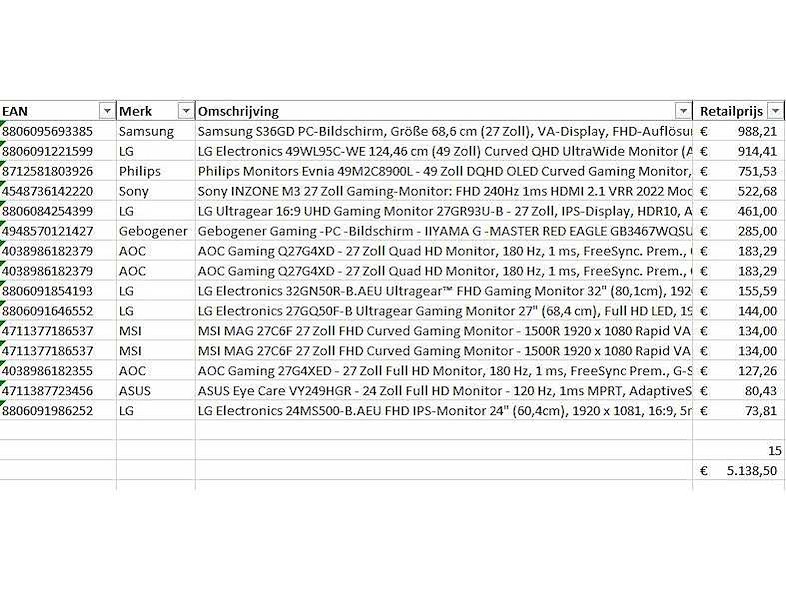 Dit betreft een partij PC Schermen / Monitors retourgoederen van een grote online retailer. De partij bestaat uit diverse diverse maten PC Schermen / Monitors. Aantal stuks: 15. Retailwaarde: €5139,- De PC chermen / Monitors zijn niet werkend en zijn te gebruiken voor onderdelen. Kom op de kijkdag om te om zo een goed beeld te krijgen van de reden van retour. Zie foto's voor lijst met inhoud. Within 14 days Merk: Pallet Retourgoederen - PC / Monitors