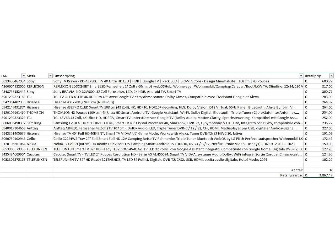 Dit betreft een partij televisies retourgoederen van een grote online retailer. De partij bestaat uit diverse diverse maten televisies. Aantal stuks: 16 Retailwaarde: €3.867,- De televisies zijn niet werkend en zijn te gebruiken voor onderdelen. Kom op de kijkdag om te om zo een goed beeld te krijgen van de reden van retour. Zie foto's voor lijst met inhoud. Bezorgtermijn 14 dagen Merk: Pallet Retourgoederen