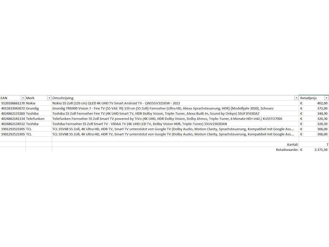 Dit betreft een partij televisies retourgoederen van een grote online retailer. De partij bestaat uit diverse diverse maten televisies. Aantal stuks: 7 Retailwaarde: €2.371,- De televisies zijn niet werkend en zijn te gebruiken voor onderdelen. Kom op de kijkdag om te om zo een goed beeld te krijgen van de reden van retour. Zie foto's voor lijst met inhoud. Bezorgtermijn 14 dagen Merk: Pallet Retourgoederen