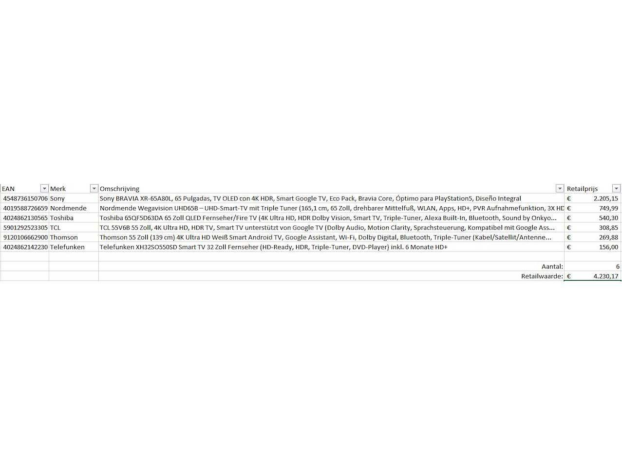 Dit betreft een partij televisies retourgoederen van een grote online retailer. De partij bestaat uit diverse diverse maten televisies. Aantal stuks: 6 Retailwaarde: €4.230,- De televisies zijn niet werkend en zijn te gebruiken voor onderdelen. Kom op de kijkdag om te om zo een goed beeld te krijgen van de reden van retour. Zie foto's voor lijst met inhoud. Bezorgtermijn 14 dagen Merk: Pallet Retourgoederen