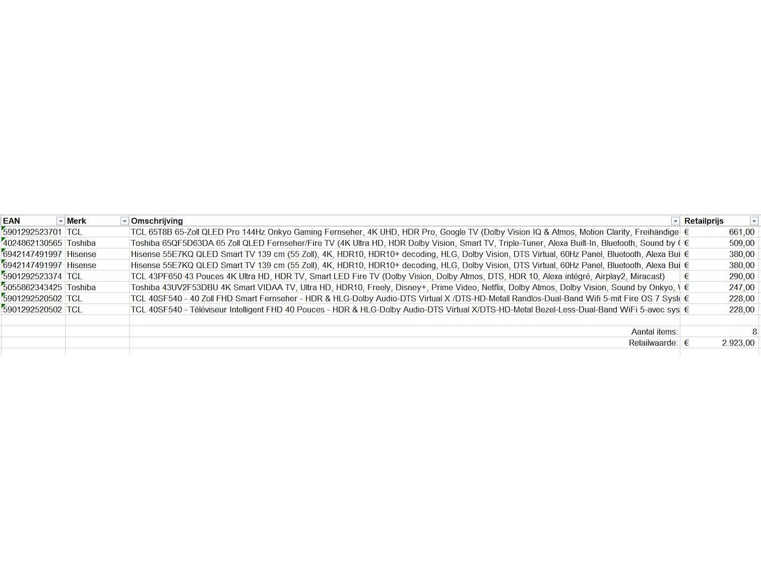 Dit betreft een partij televisies retourgoederen van een grote online retailer. De partij bestaat uit diverse diverse maten televisies. Aantal stuks: 8. Retailwaarde: €2923,- De televisies zijn niet werkend en zijn te gebruiken voor onderdelen. Kom op de kijkdag om te om zo een goed beeld te krijgen van de reden van retour. Zie foto's voor lijst met inhoud. Merk: Pallet Retourgoederen