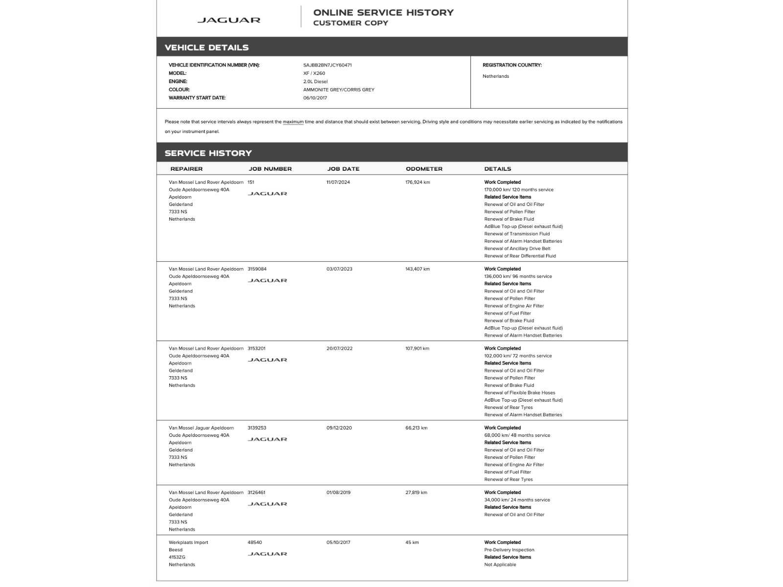 LET OP!: voor Nederlandse kopers en kopers van buiten de EU komt de Rest-BPM er nog bij, deze verschijnt later op de factuur en bedraagt € 2.448,-. Dus totale biedprijs + € 2.448,-. De totaalprijs bij het bieden is dus excl. BPM! (This is only relevant for Dutch buyers and buyers from outside the EU) Important: international buyers (within the EU) can reclaim the remaining amount Dutch BPM tax ('rest-BPM'). For this lot, buyer pays the BPM tax as a deposit and after registering this lot in your country, the deposit will be refunded. Dutch and non-EU buyers will pay the BPM via the invoice of this lot. Kenteken: PZ-465-J Merk: Jaguar Model: XF Sportbrake Type: 2.0d Portfolio Afgelezen kilometerstand: 207201km Cilinderinhoud: 1999cc Vermogen (kW): 132kW Brandstof: diesel Chassisnummer: SAJBB2BN7JCY60471 Laadvermogen: 0kg NAP status: Logisch Datum eerste toelating: 2017-10-11 Datum eerste toelating (NL): 2017-10-11 APK vervaldatum: 2025-10-11 Vermogen (pk): 179hp Aandrijving: achterwiel Aantal zitplaatsen: 5 Maximaal trekgewicht ongeremd: 750kg Maximaal trekgewicht geremd: 2000kg Kleur: Ammonite Grey Metallic Transmissie: Automaat Stuurwiel: links gestuurd Emissieklasse: 6 Aantal deuren: 4 Ledig gewicht: 1718kg Aantal cilinders: 4 Carrosserie: stationwagen Nationaliteit documenten: Nederlandse kentekendocumenten Onderhoudshistorie: ja volledig Carfax Link: https://was.carfax.eu/v0/api/ccdid/5100016408/svc/201/vinreg/PZ465J/checksum/eyJhbGciOiJIUzI1NiIsInR5cCI6IkpXVCJ9.eyJleHAiOjE3NDc2NTc3NDN9.Sonfzg1ySuJGmjyY-FtFsxm1Cq5FiWlSb1cLlsa-ayE