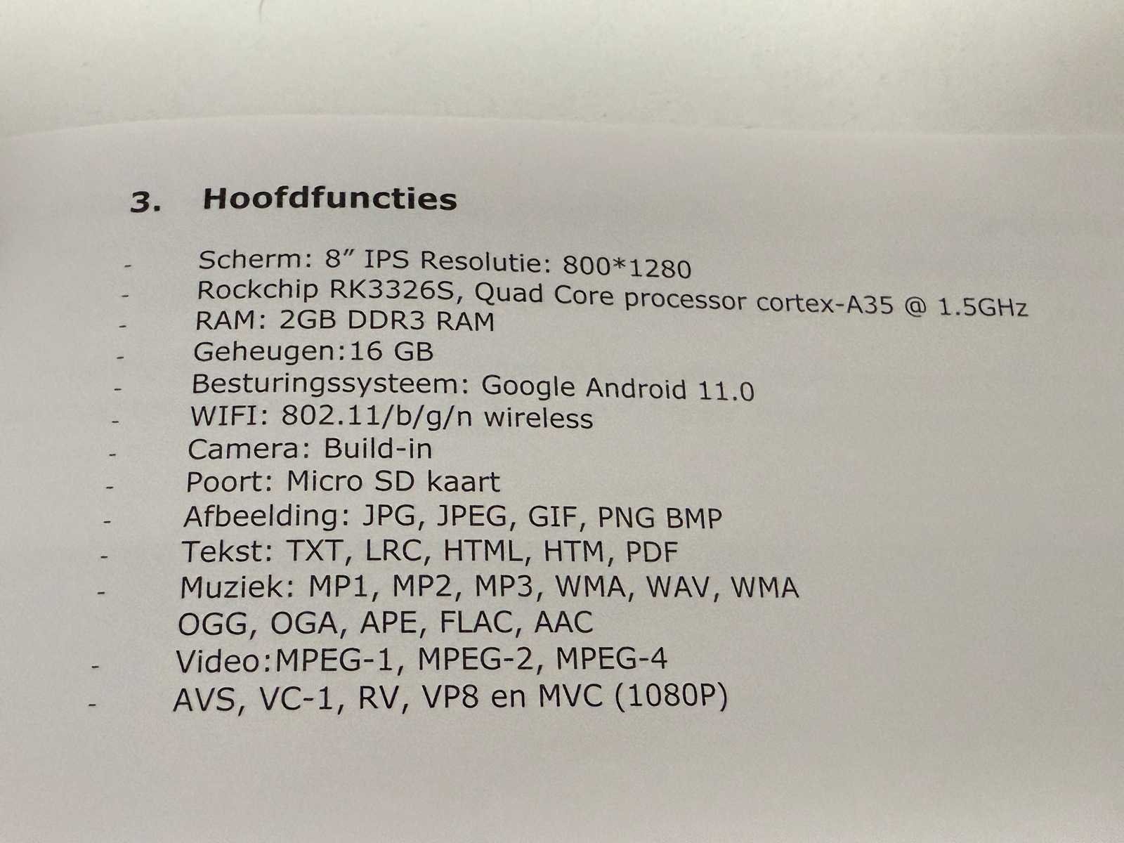 ONGEBRUIKT! in verpakking. 8'' Tablet + WIFI + bluetooth + Toetsenbord + Cover + Oordopjes + USB-kabel 2GB RAM + 16GB geheugen Extra Micro USB tot max 32GB mogelijk. + Camera +SD-Poort +Muziek MP1,MP2,MP3, WMA, WAV, WMA Video, MPEG-1 , MPEG-2, MPEG-4 Google Android besturing 11.0 Model: YC-83P Processor type: cortex-A35 Processorsnelheid Ghz: 1.5 SIM: true Camera: true Card reader: true Besturingssysteem: Google Android USB-Type: USB-C USB: 1 Wifi: true Bluetooth: true Touchscreen: true Capaciteit external geheugen: 32GB Geheugen: 16GB