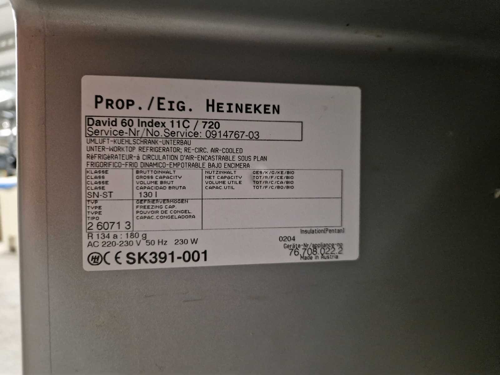 Inhoud 130 Liter Merk: Heineken david Type: biertap Totale afmeting L: 600mm Totale afmeting Breedte: 550mm Totale afmeting Hoogte: 950mm Serienummer: 0914767-03