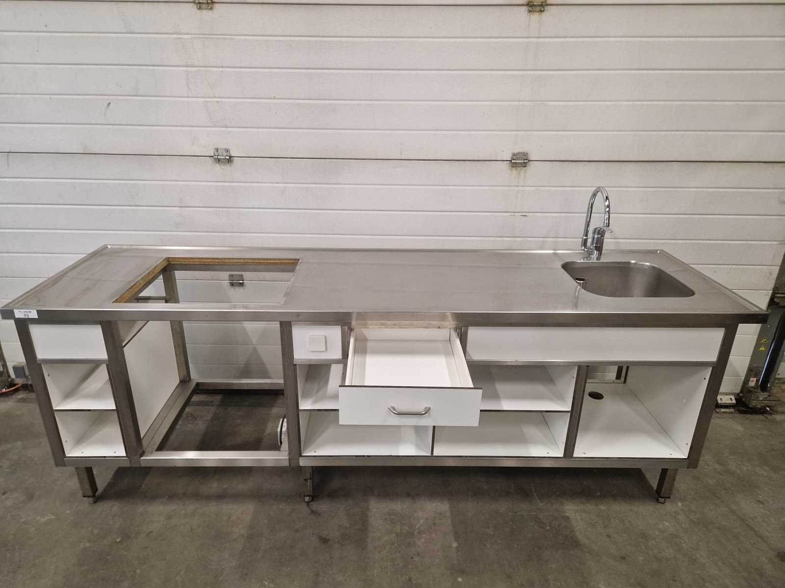 Voorzien van stopcontact en lade wasbak 40x40x20 cm Lengte: 250cm Breedte: 70cm Hoogte: 90cm Materiaal: rvs / trespa