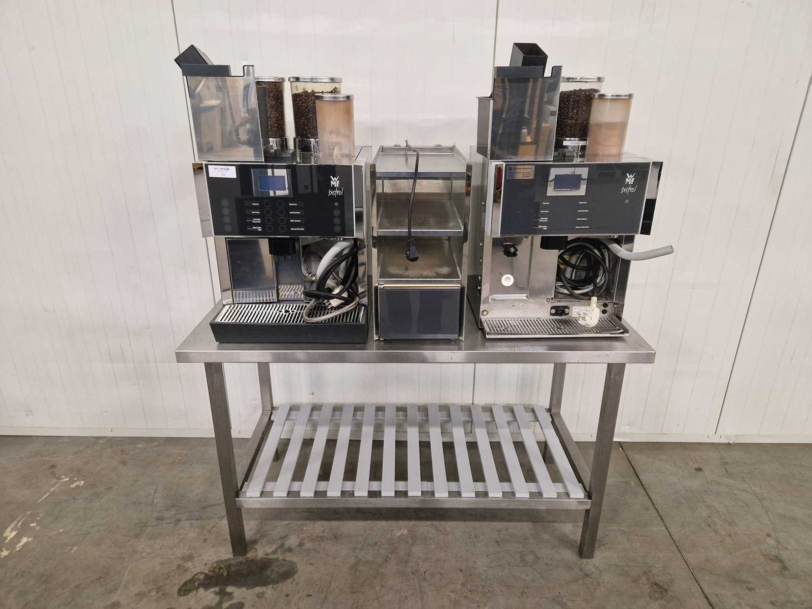 WMF Bistro bestaat uit twee volautomatische koffiemachines, beide van het type 03.8400, met verschillende productnummers: 04515 en 04516. De machines werken op 380–400V en hebben een gezamenlijk vermogen van 6,3 kW. Ze worden geleverd inclusief de bijbehorende tafel/onderstel waarop de machines zijn geplaatst. De totale afmeting van het geheel bedraagt 140 x 70 x 86 cm. Merk: WMF Type: 03.8400 Aansluiting: 380-400V Serienummer: 04515 - 04516 Digitale uitlezing: true Capaciteit.: 6.3kW Totale afmeting L: 140mm Totale afmeting Breedte: 70mm Totale afmeting Hoogte: 86mm