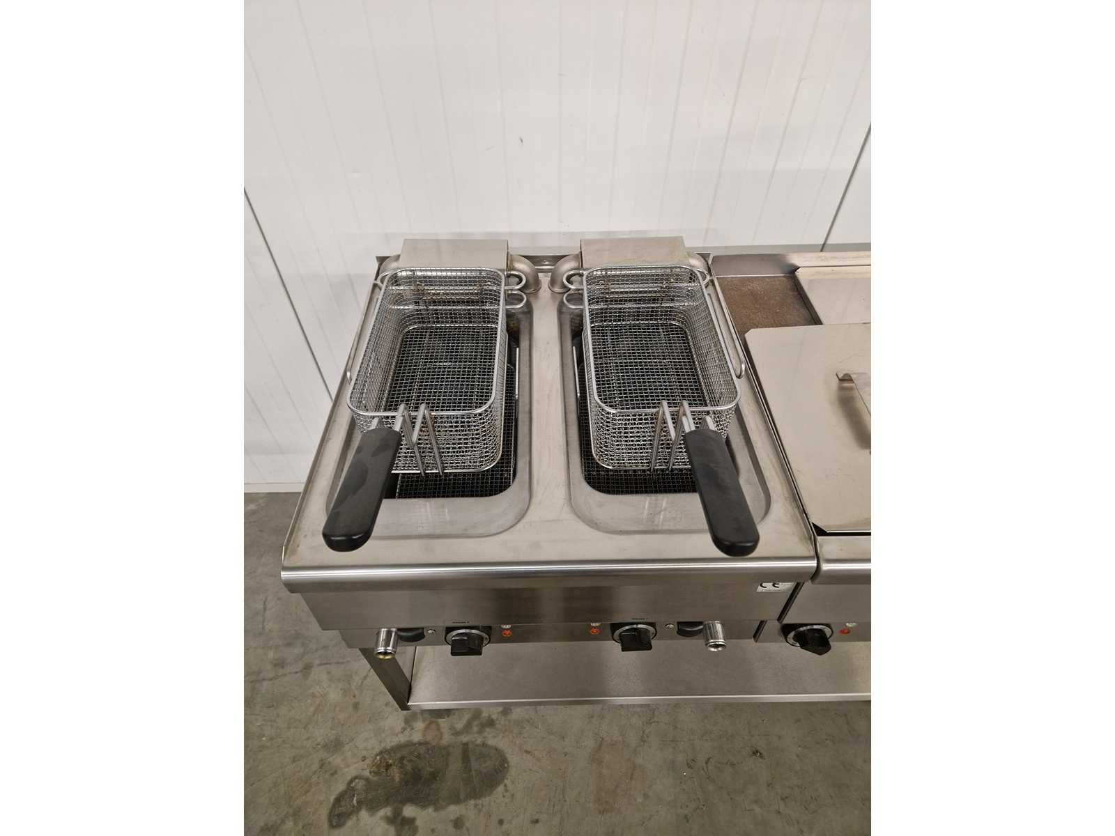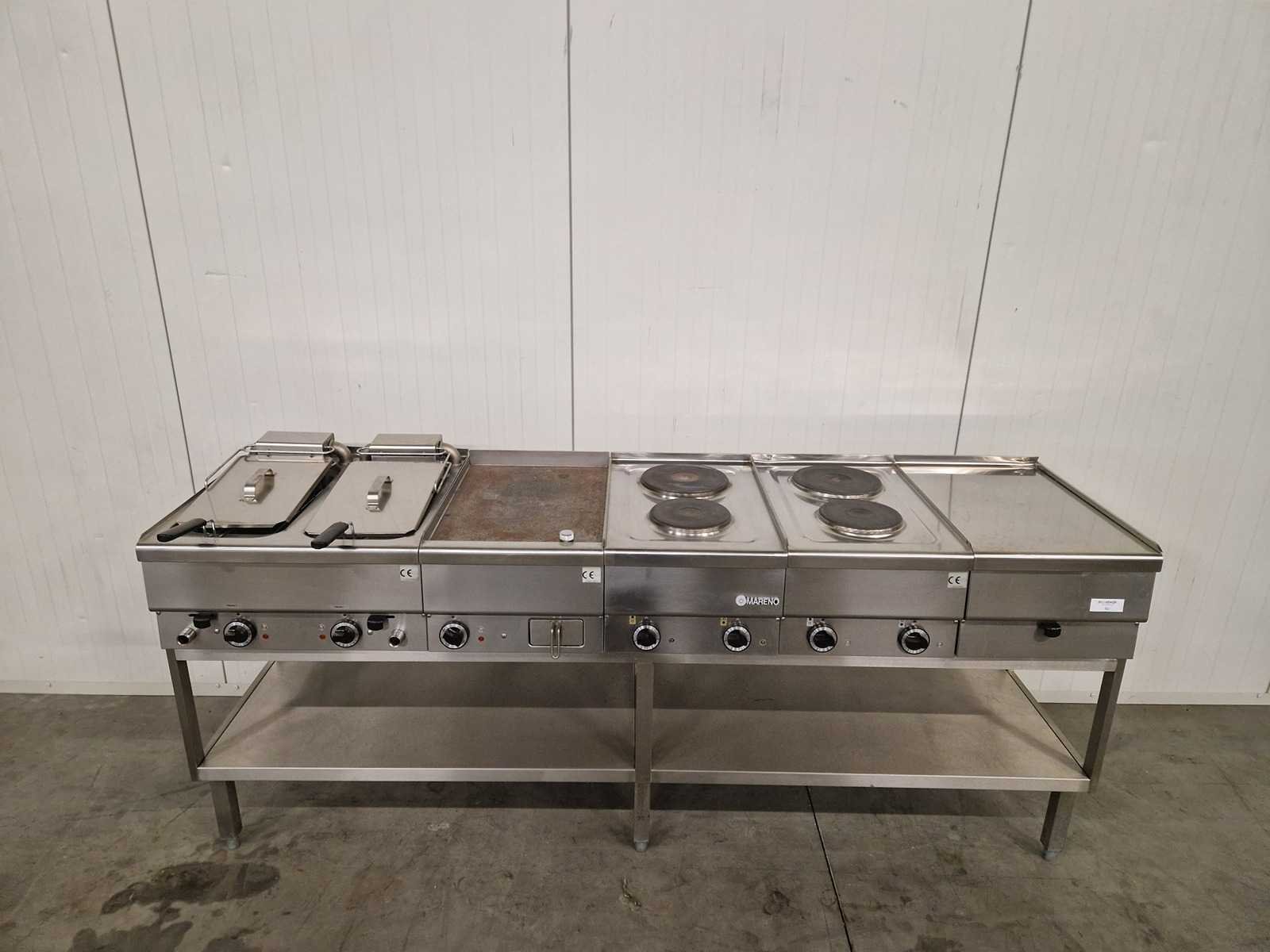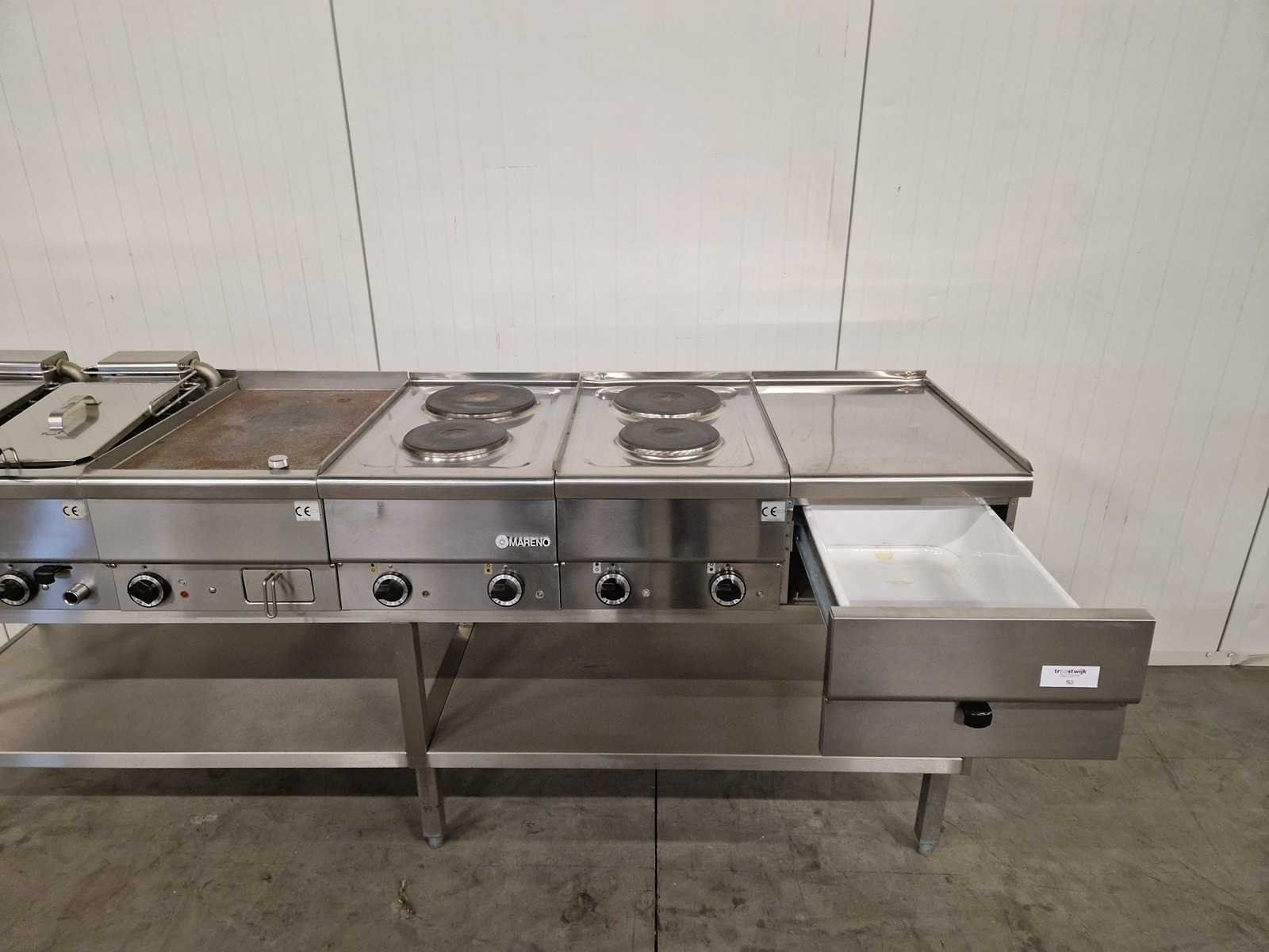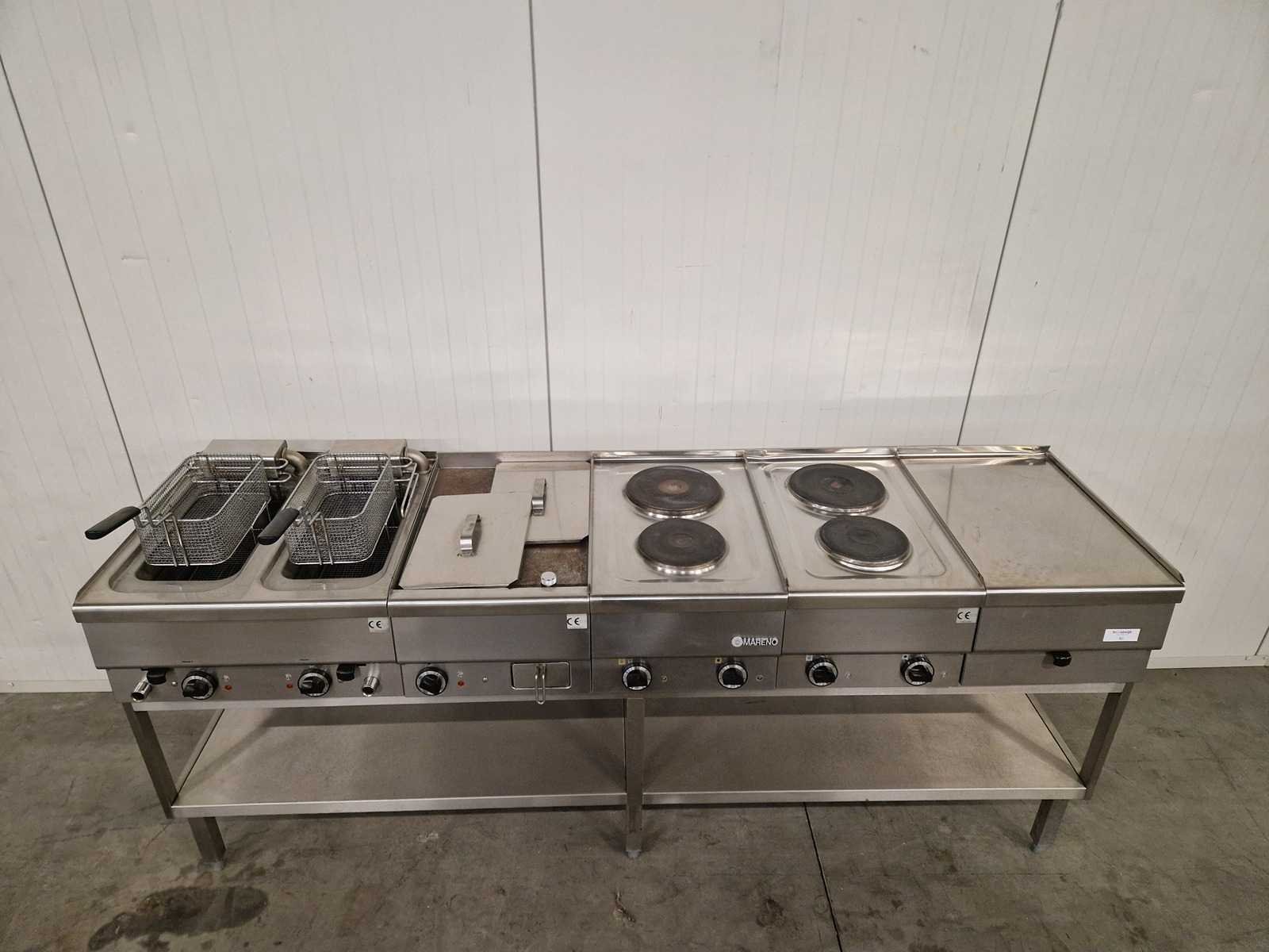 Mareno kooklijn met 4-pits elektrisch fornuis (type PCE-40, 2x), dubbele elektrische friteuse (type FQE-61) met 2×10 liter inhoud en 19 kW, en een gladde bakplaat (type FTE-40B) van 3,9 kW. Alle apparatuur werkt op 400V. Totale afmetingen: 220 cm breed, 60 cm diep, 85 cm hoog. Merk: Mareno Type: 4-pits fornuis, dubbele friteuse, bakplaat Model: Elektrisch Totale afmeting L: 220mm Totale afmeting Breedte: 60mm Totale afmeting Hoogte: 85mm Materiaal: RVS Aansluiting: 400V