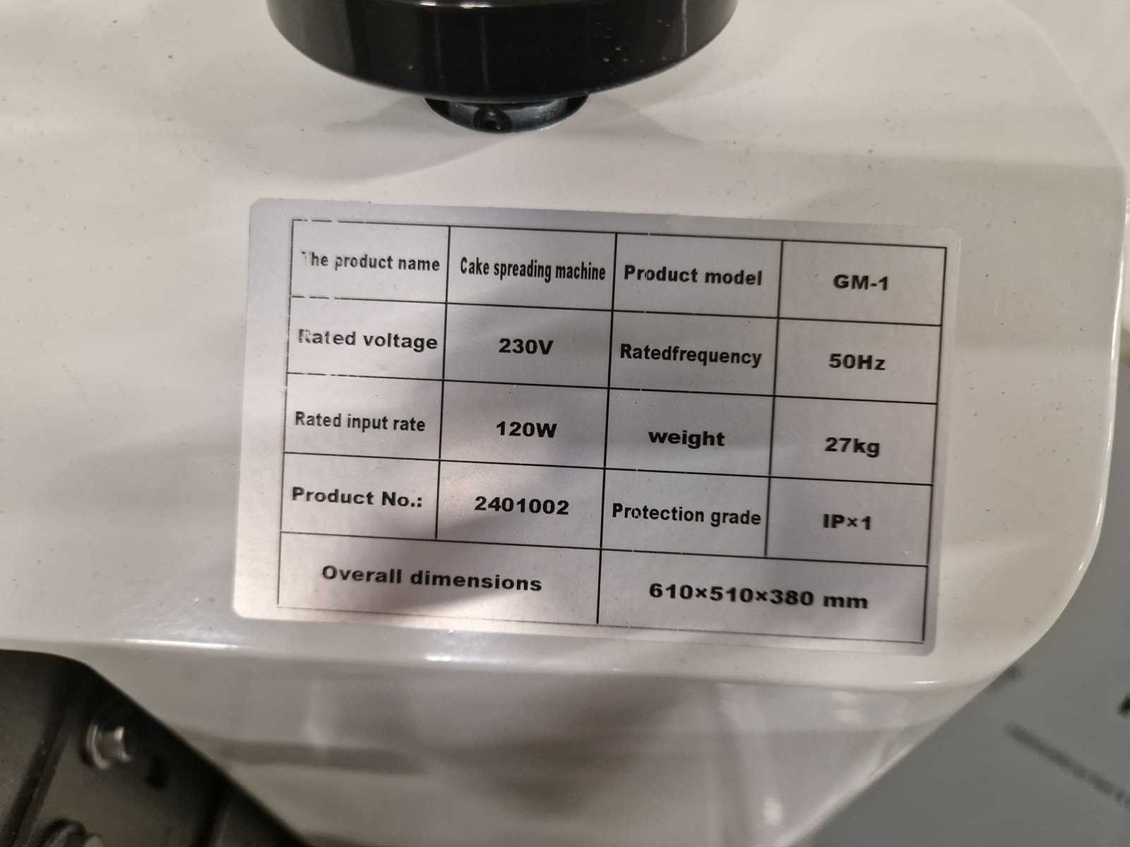 Cake Spreading Machine GM‑1 De GM‑1 is een compacte en efficiënte cake spreading machine, ontworpen voor het gelijkmatig aanbrengen van crèmes of toppings op taarten en gebak. Met een vermogen van 120 watt en werkend op 230V (50Hz) is deze machine uitermate geschikt voor professioneel gebruik in bakkerijen en patisserieën. De machine heeft een stevige RVS behuizing, een gewicht van 27 kg en afmetingen van 610 x 510 x 380 mm. Dankzij het eenvoudige ontwerp en de IP×1-beschermingsklasse is de GM‑1 makkelijk schoon te houden en te bedienen. Modelnummer: GM‑1 – Productnummer: 2401002 Type: GM-1 Totale afmeting L: 61mm Totale afmeting Breedte: 51mm Totale afmeting Hoogte: 38mm Materiaal: rvs Serienummer: 2401002 Eigen gewicht: 27kg Aansluiting: 230V