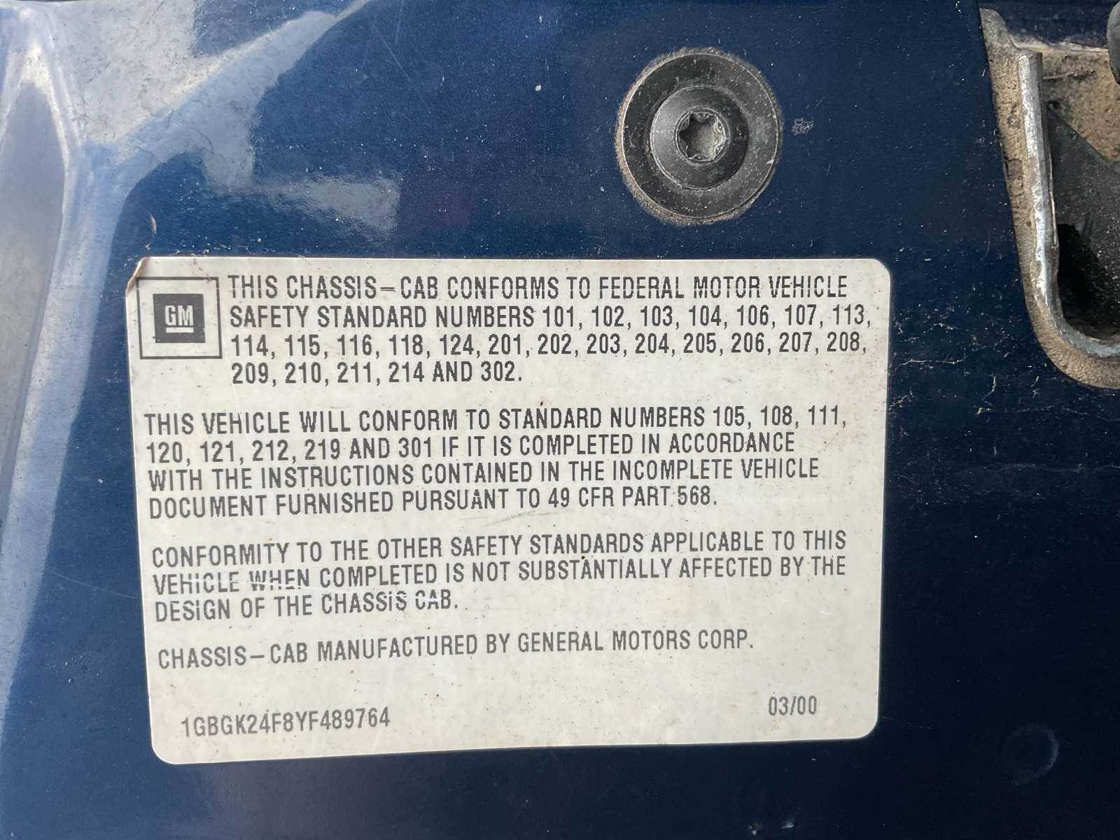 Geen sleutel; voertuig gedrained; aandrijfas licht beschadigd Merk: Chevrolet Type: 2500 Bouwjaar: 2000 Brandstof: benzine Afgelezen mijlenstand: 81954mi Chassisnummer: 1GBGK24F8YF489764 Aandrijving: 4x4 Aantal zitplaatsen: 3 Transmissie: Automaat Aantal deuren: 2 Aantal cilinders: 8 Start en rijdt: Nee Zichtbare schade: Ja Vierwielaandrijving 4x4: true