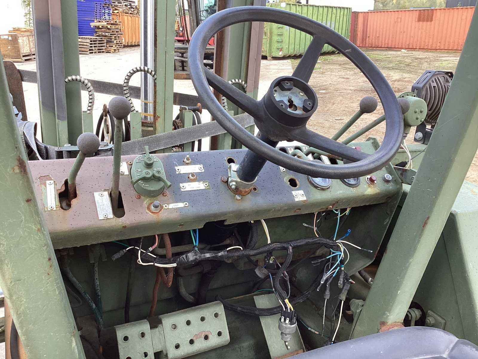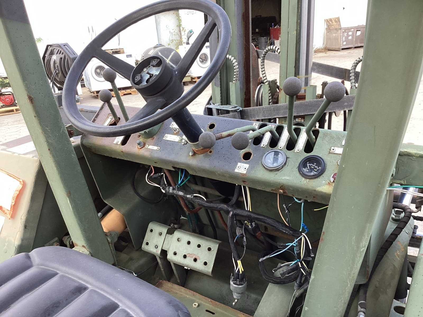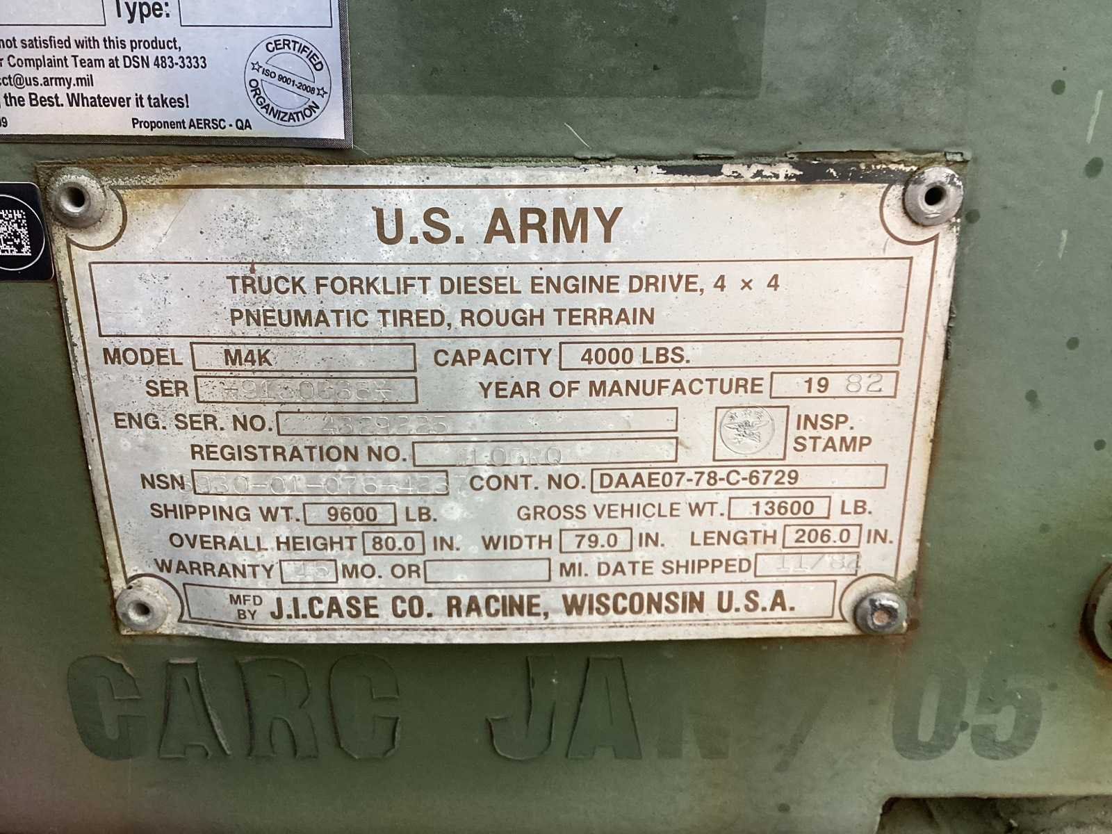 Gedrained; werking onbekend; cnh dieselmotor; 4 cilinder; capaciteit 4000 lbs; eigen gewicht 9600 kg; Merk: Case Type: M4K Bouwjaar: 1982 Serienummer: 9150636 Brandstof: Diesel Mast: Duplex Soort band: Luchtbanden Aantal wielen: 4 Afgelezen urenstand: 1313 Ruw terrein: true Side-shift: true Hydraulisch verstelbare lepels: true Duplex mast: true Lepellengte: 1040mm Luchtbanden: true Minimale doorrijhoogte: 2050mm Diesel: true