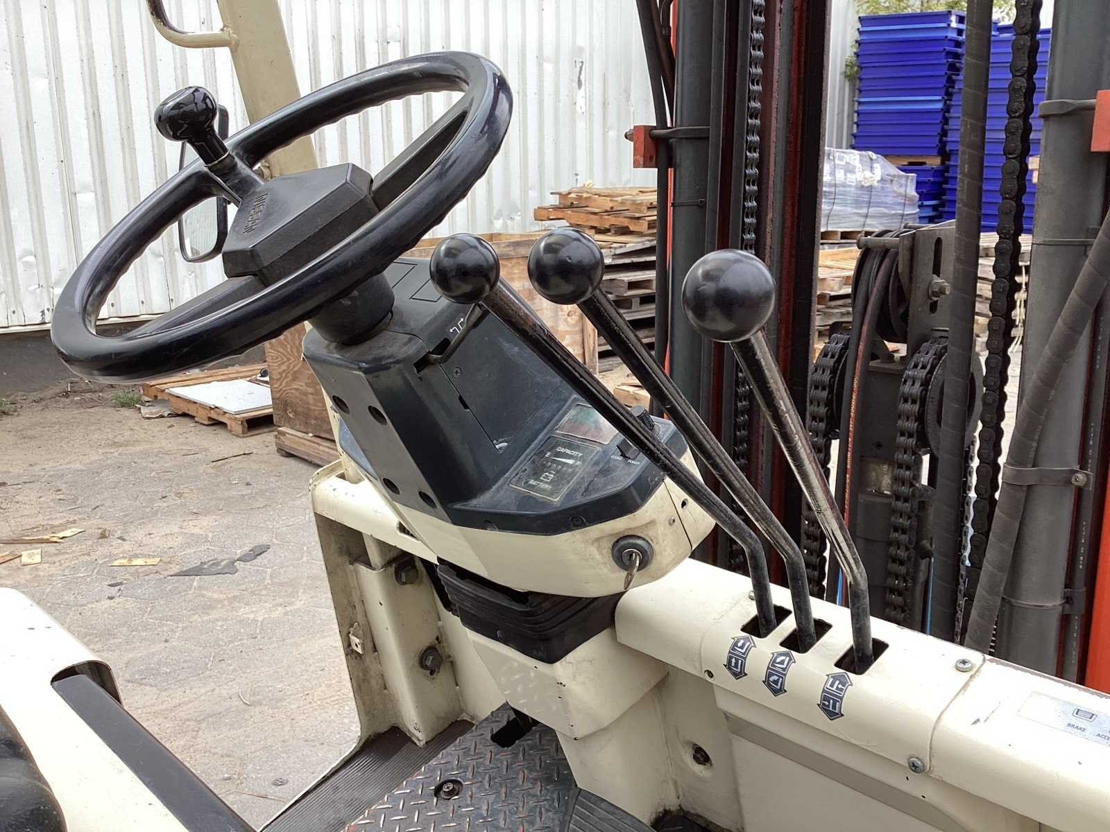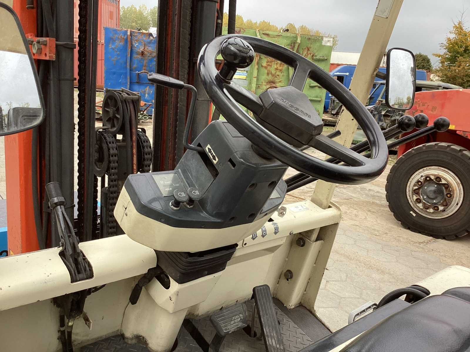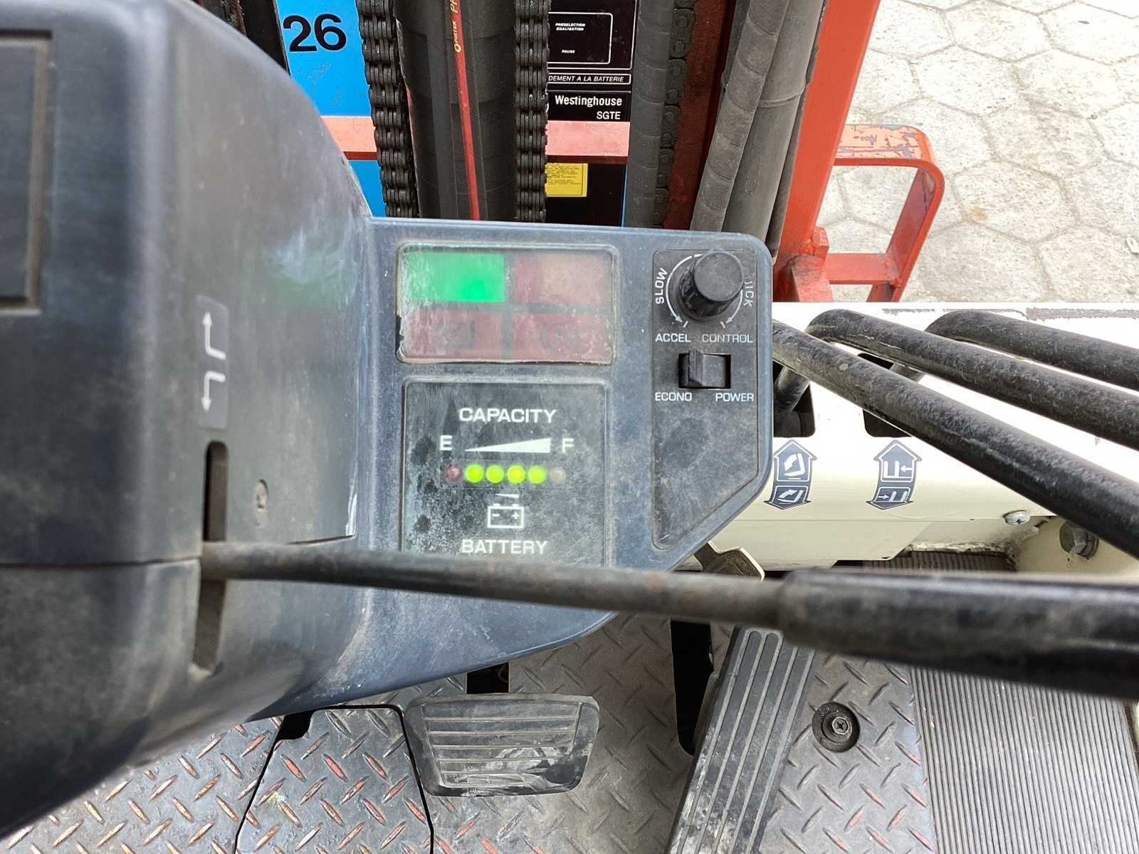 Merk: Nissan Type: YM02R-25U Serienummer: 001019 Brandstof: Elektrisch Mast: Triple Soort band: Volrubber banden Aantal wielen: 4 Afgelezen urenstand: 8111 Accu lader: true Free-lift: true Side-shift: true Triple mast: true Eigen gewicht: 4500kg Hefvermogen: 2500kg Lepellengte: 1200mm Max. hefhoogte: 4750mm Hefhoogte: 4750mm Minimale doorrijhoogte: 2300mm