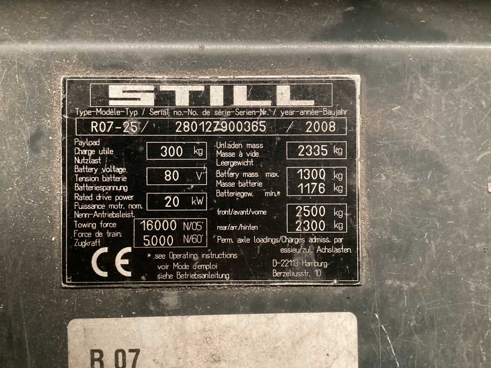 Geen lader; Merk: Still Type: R07-25 Bouwjaar: 2008 Serienummer: 280127900365 Afmeting l: 2900cm Afmeting b: 1300cm Afmeting h: 1800cm Eigen gewicht: 3500kg