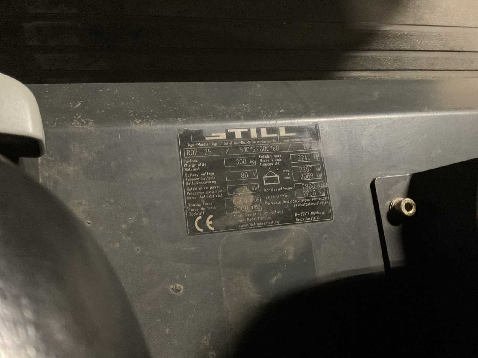 Geen lader; Merk: Still Type: R07-25 Bouwjaar: 2016 Serienummer: 510127G00qip Afmeting l: 3340cm Afmeting b: 1300cm Afmeting h: 1300cm Eigen gewicht: 2240kg