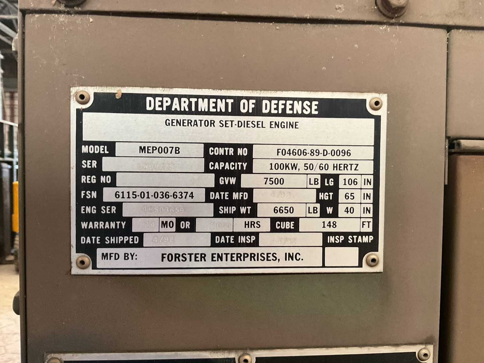 Merk: Forster enterprises Type: MEP007B Bouwjaar: 1992 Serienummer: BW00225 Diesel: true Type motor: Caterpillar Aantal cilinders: 6 Motorvermogen (kW): 100kW Watergekoeld: true Afgelezen urenstand: 26 Totale afmeting L: 2650mm Totale afmeting Breedte: 1000mm Totale afmeting Hoogte: 1650mm