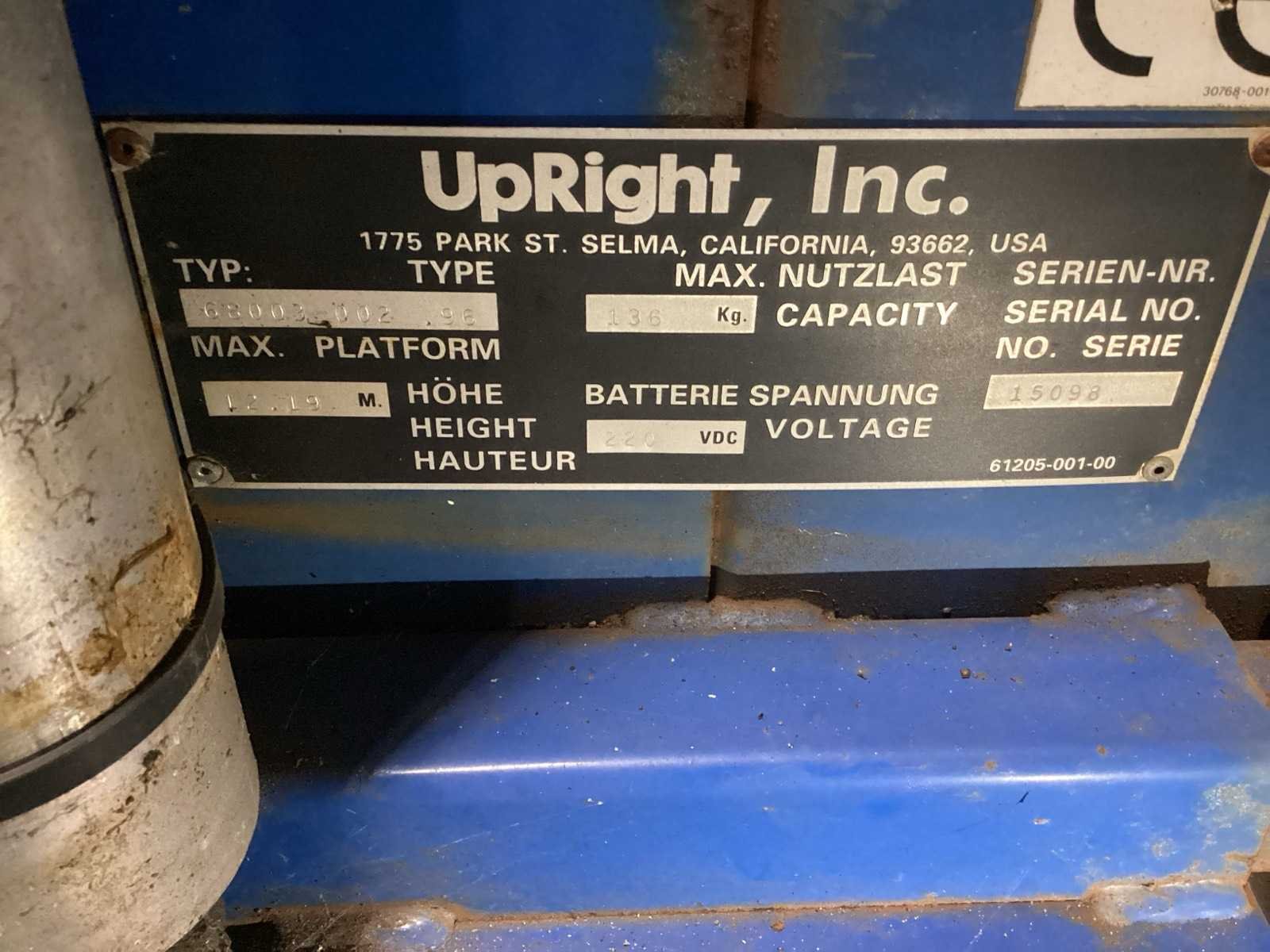 Merk: UpRight Type: 68003-002.96 Serienummer: 15098 Elektrisch: true Telescoop hoogwerker: true Werkhoogte: 12000mm Plateau afm. l: 660mm Plateau afm. b: 660mm Platform capaciteit: 136kg Totale afmeting L: 1250mm Totale afmeting Breedte: 700mm Totale afmeting Hoogte: 2850mm