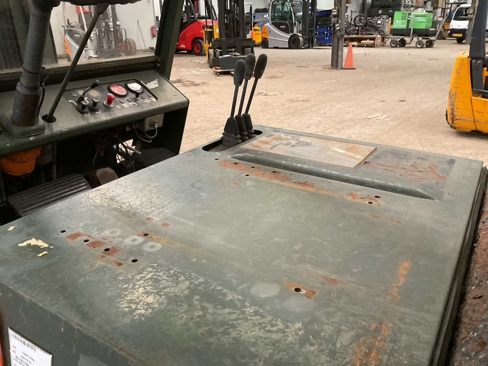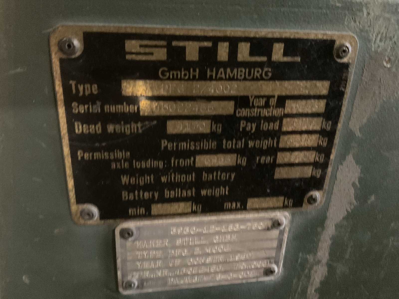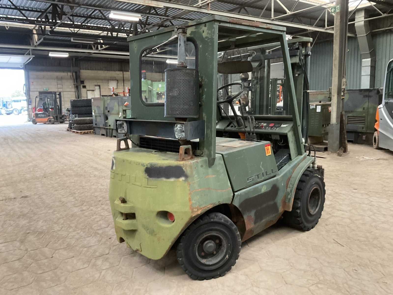 Merk: Still Type: DGF2/4002 Bouwjaar: 1985 Serienummer: 43022455 Brandstof: Diesel Mast: Triple Soort band: Volrubber banden Aantal wielen: 4 Afgelezen urenstand: 3722 Free-lift: true Triple mast: true Eigen gewicht: 4170kg Hefvermogen: 1800kg Minimale doorrijhoogte: 2100mm Diesel: true