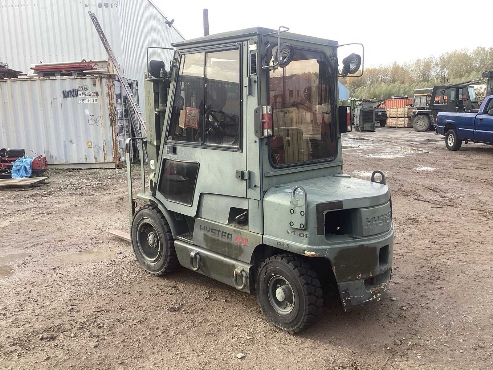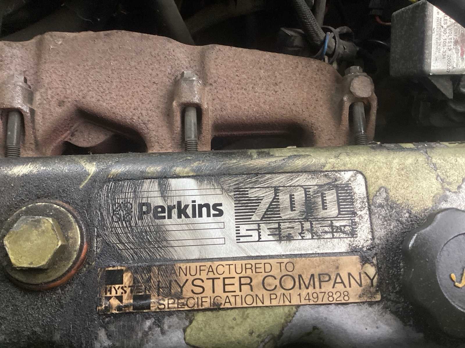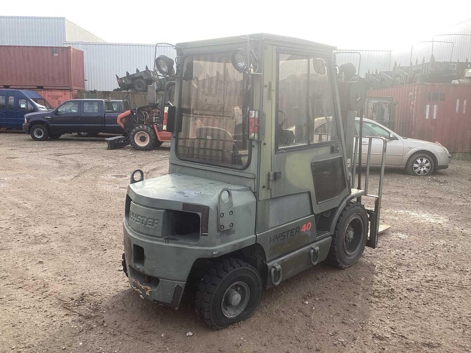 Perkins dieselmotor; 4 cilinder; Merk: Hyster Type: H40XM Serienummer: H177G41355A Brandstof: Diesel Mast: Triple Soort band: Luchtbanden Aantal wielen: 4 Free-lift: true Side-shift: true Triple mast: true Eigen gewicht: 3770kg Hefvermogen: 1800kg Lepellengte: 1050mm Luchtbanden: true Minimale doorrijhoogte: 2200mm Diesel: true