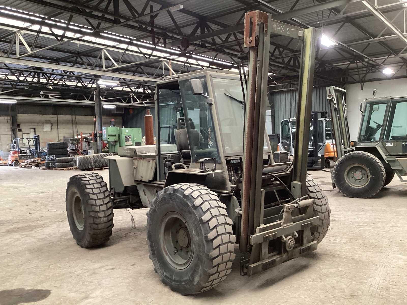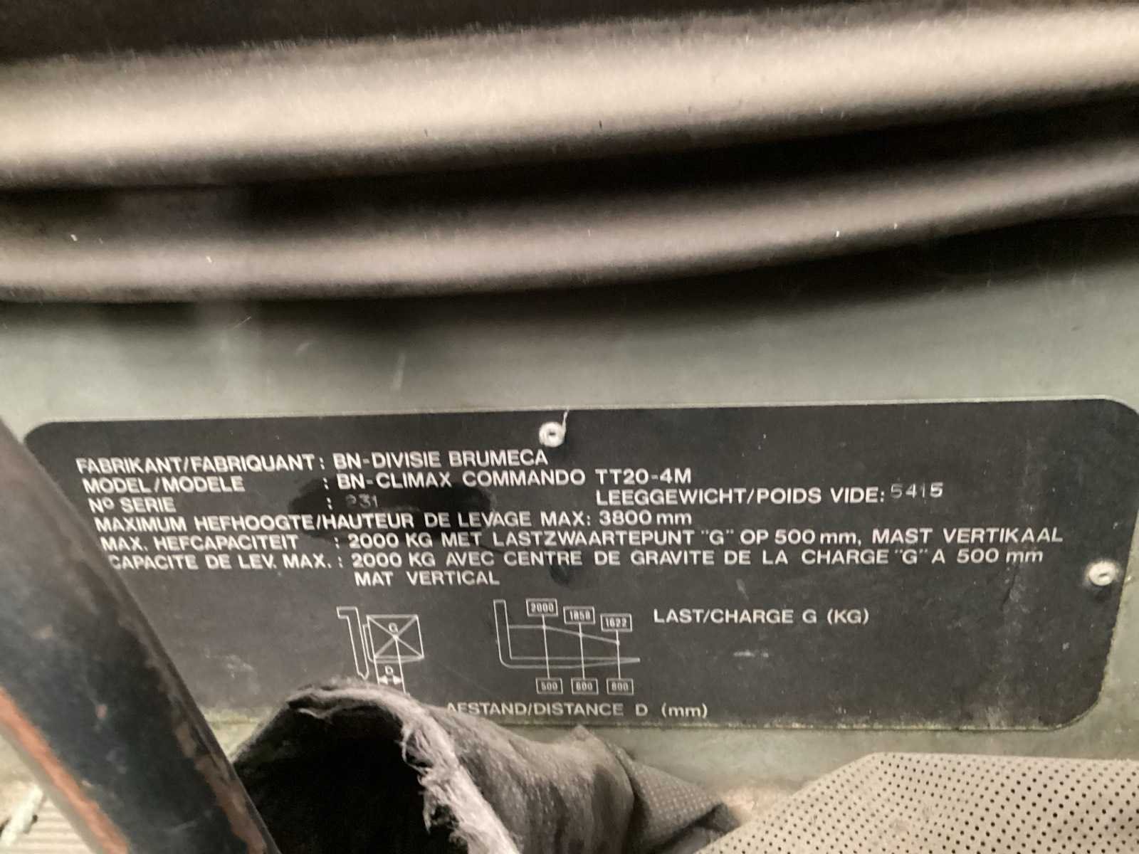 Geen sleutel; perkins dieselmotor; 4 cilinder; aandrijfas beschadigd Merk: Brumeca Type: TT20-4M Serienummer: 231 Brandstof: Diesel Mast: Duplex Soort band: Luchtbanden Aantal wielen: 4 Afgelezen urenstand: 3184 Ruw terrein: true Side-shift: true Triple mast: true Eigen gewicht: 5415kg Hefvermogen: 2000kg Hefhoogte: 3400mm Luchtbanden: true Minimale doorrijhoogte: 2800mm Diesel: true