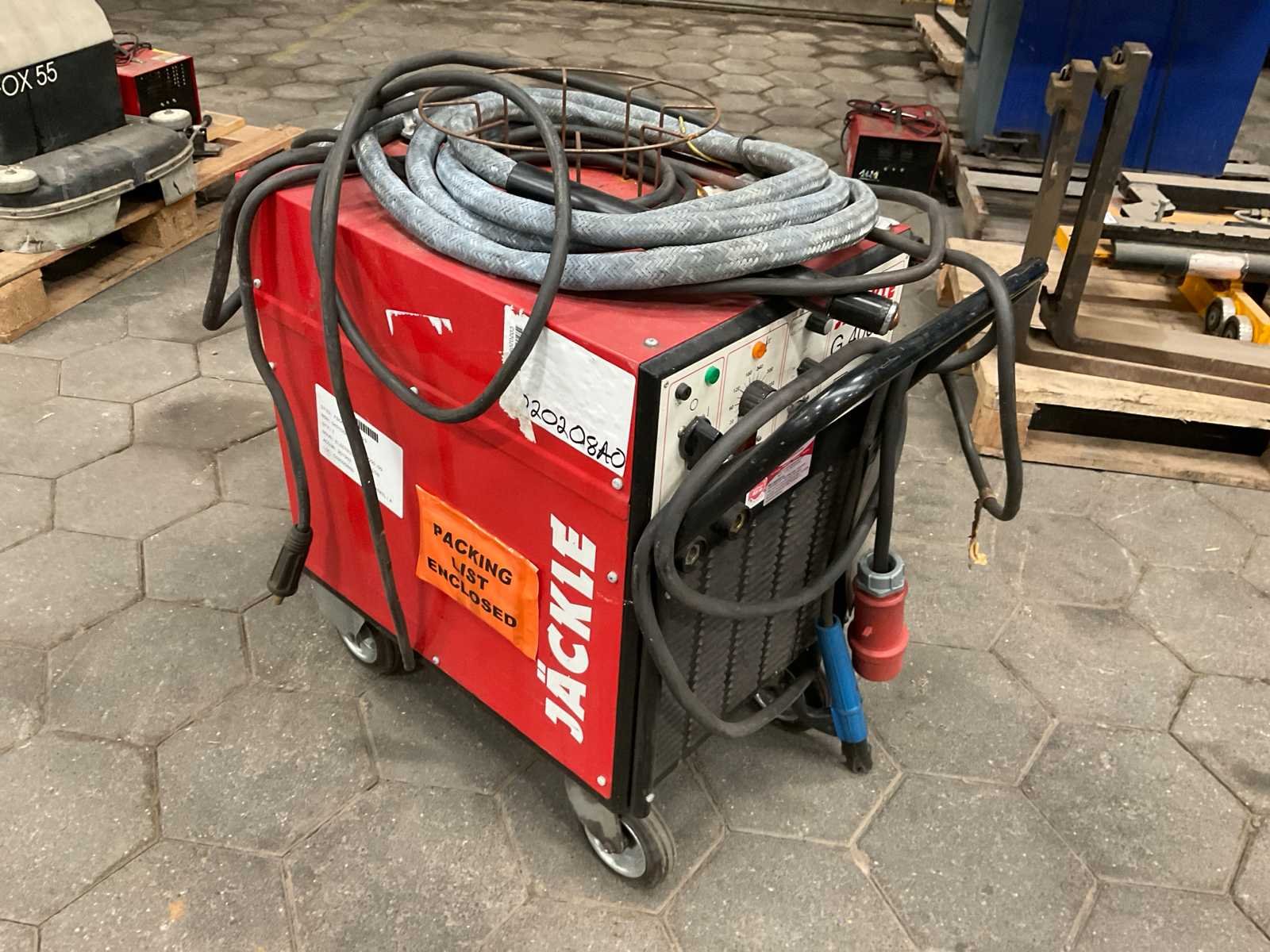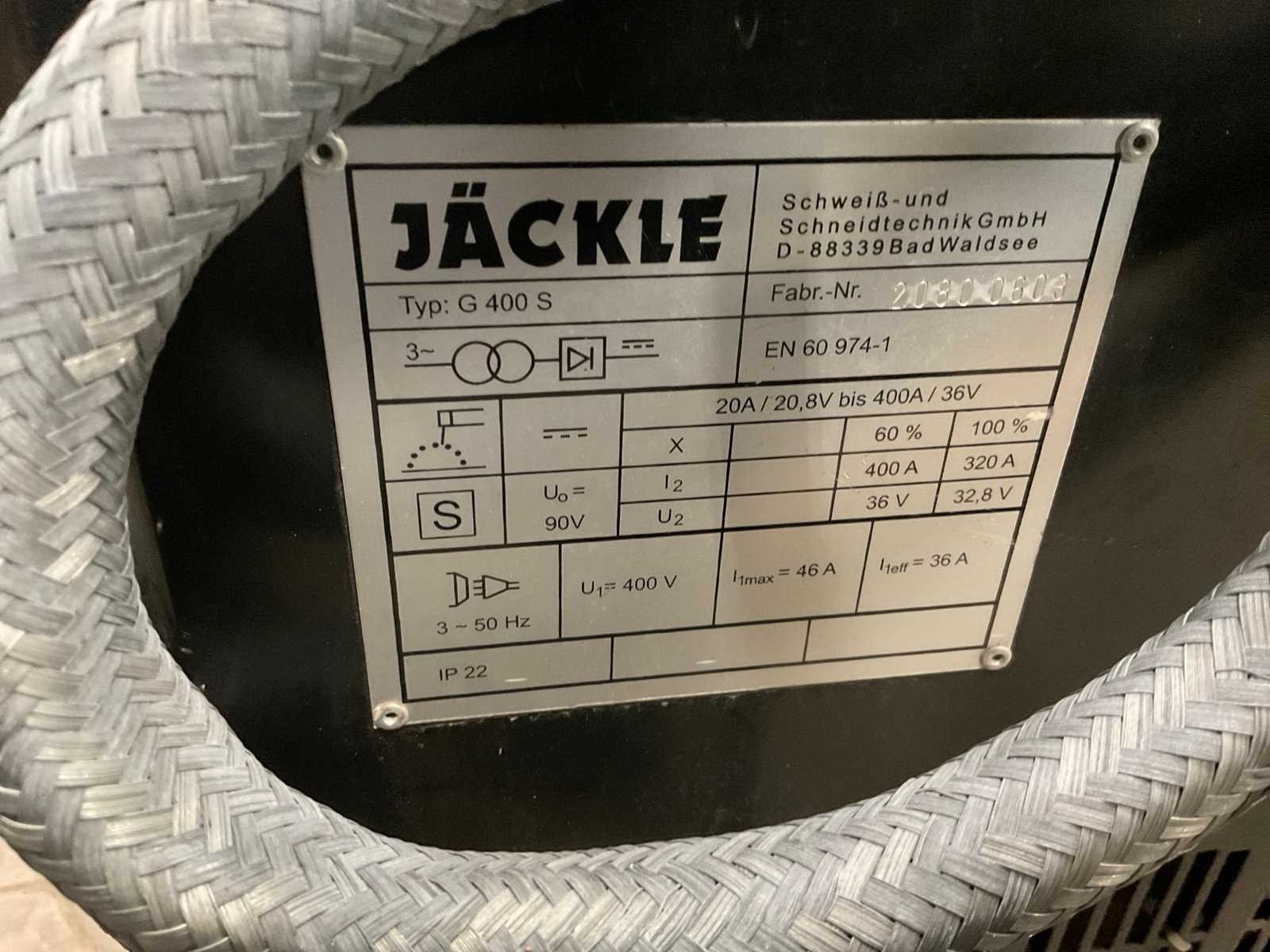 Merk: Jäckle Type: G400S Serienummer: 20800603 Ampère belasting: 400A Inschakelduur: 60% Afmeting l: 770mm Afmeting b: 430mm Afmeting h: 850mm