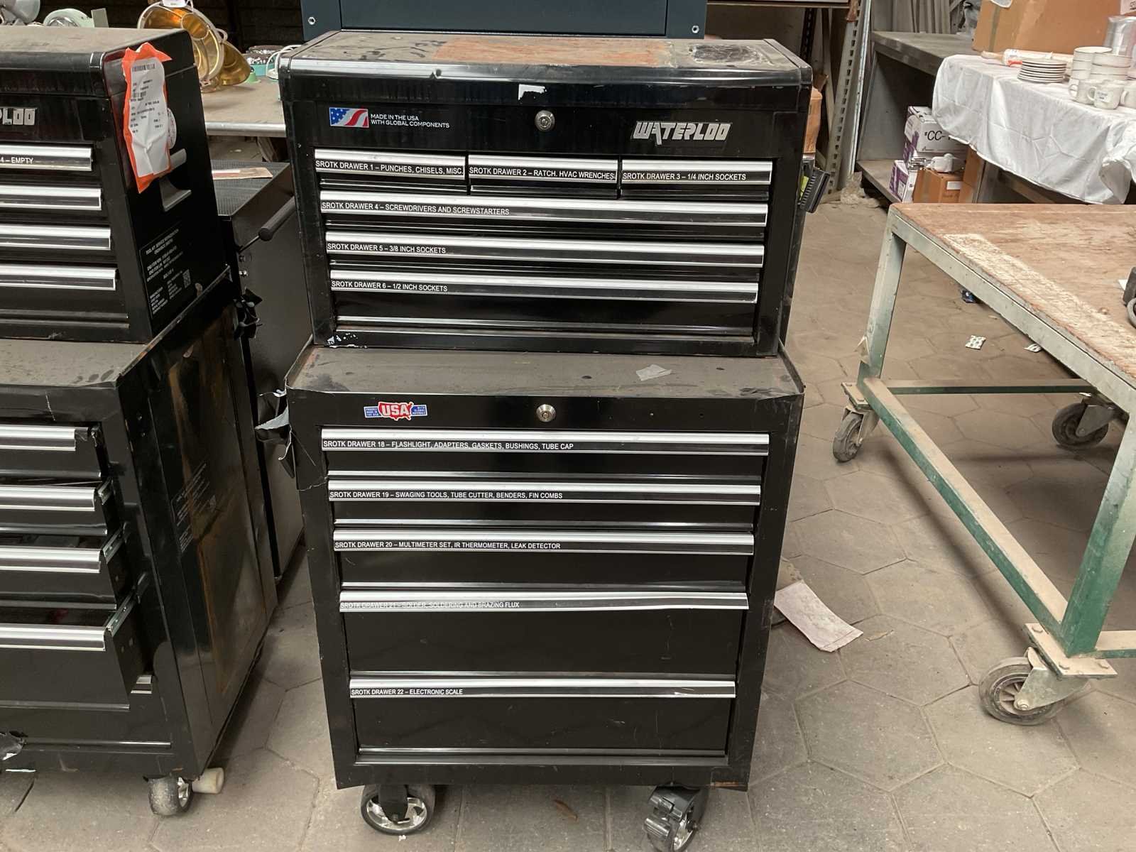 2x gereedschapskist en 2x gereedschapswagen met inhoud Merk: Waterloo Totale afmeting L: 480mm Totale afmeting Breedte: 680mm Totale afmeting Hoogte: 1260mm
