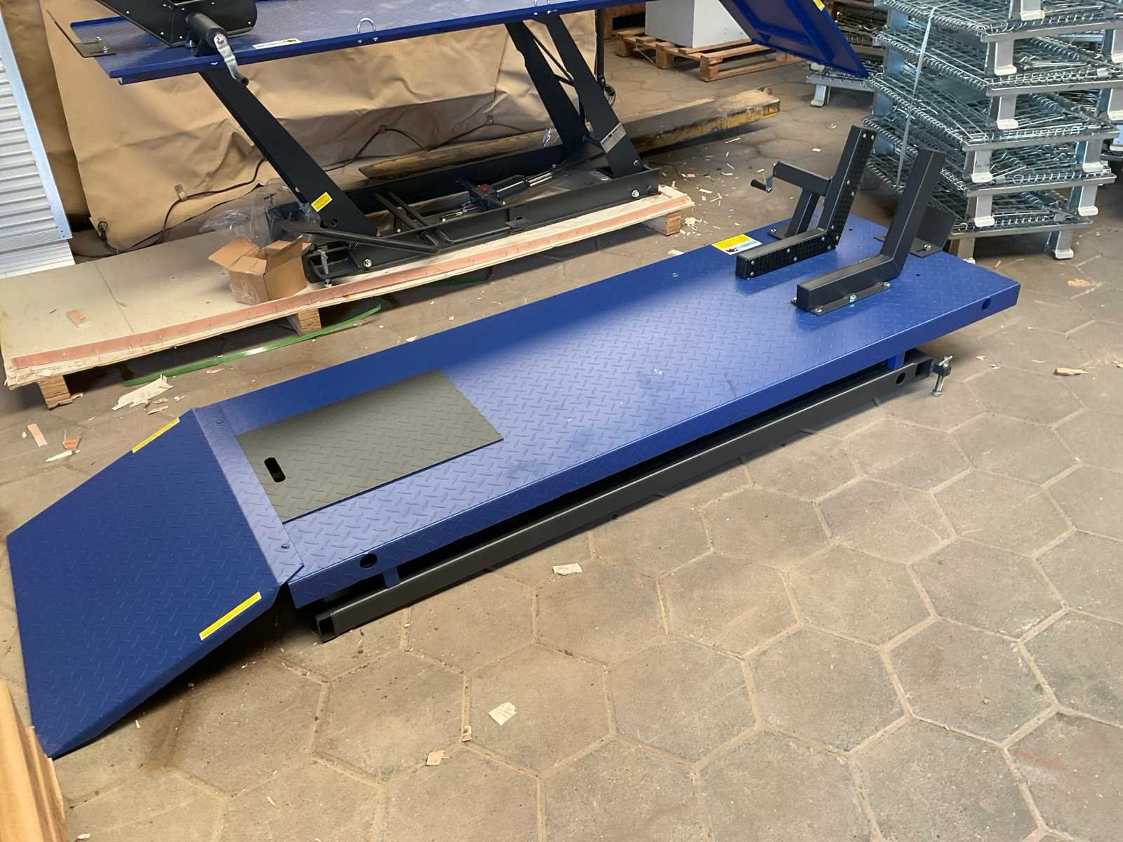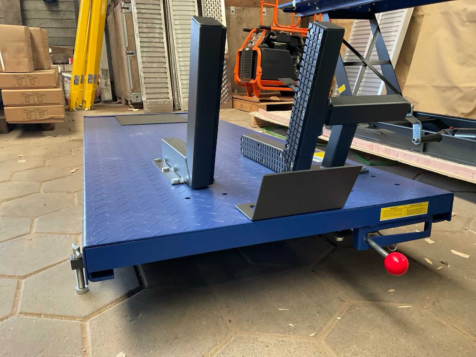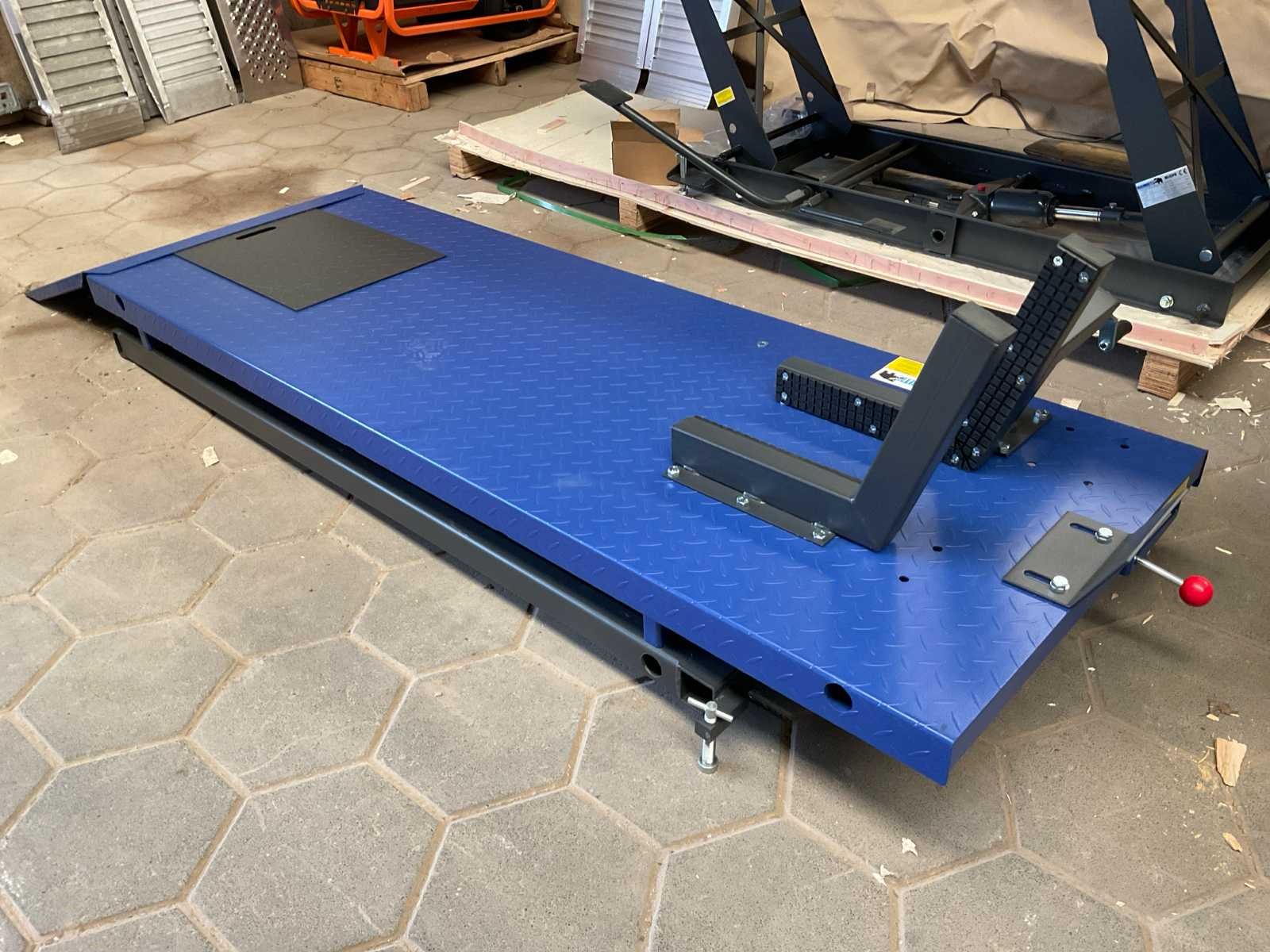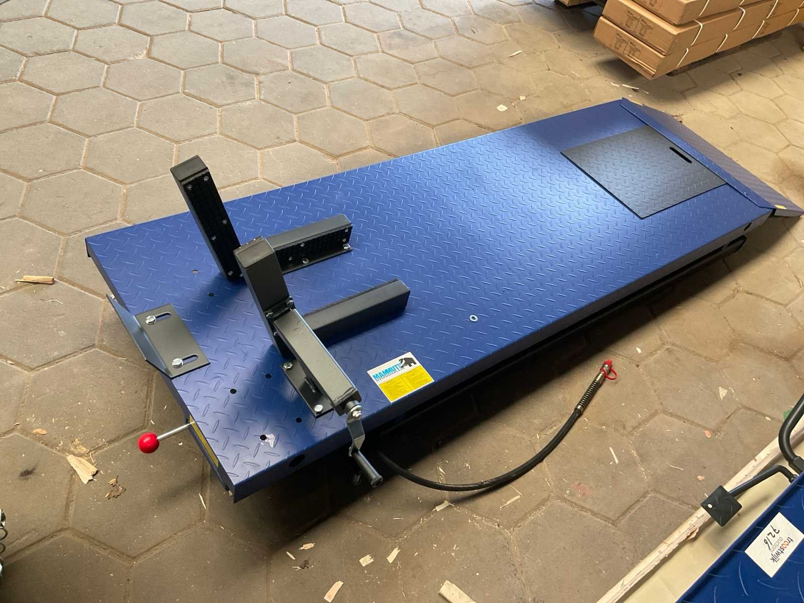 Hydraulisch en pneumatisch; Merk: Mammuth Capaciteit.: 675kg Baanbreedte: 710mm Eigen gewicht: 174kg Totale afmeting L: 2540mm Totale afmeting Breedte: 700mm Totale afmeting Hoogte: 1145mm