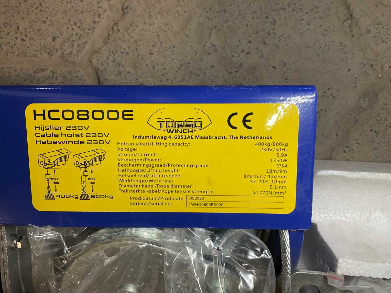 Merk: Torso Type: HC0800E Hijsvermogen: 800kg Max. hefhoogte: 9m Aansluiting: 230V