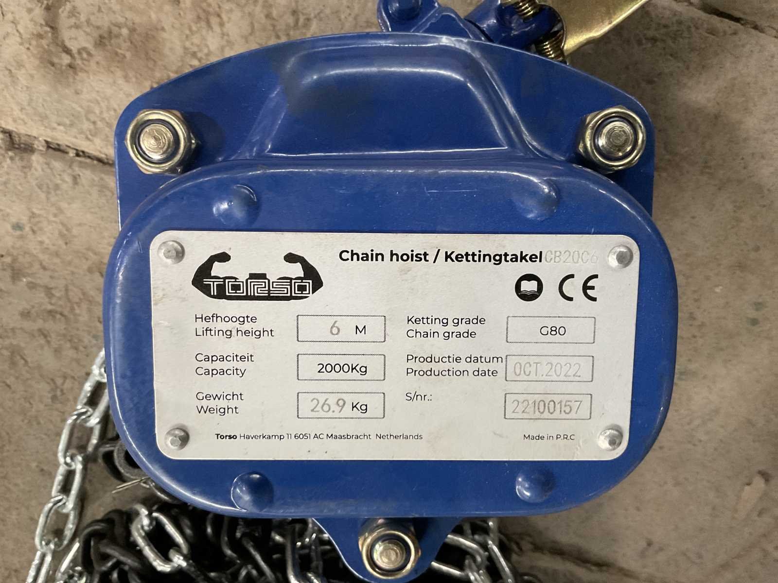 Merk: Torso Type: CB20C6 Bouwjaar: 2022 Serienummer: 2210057 Hijsvermogen: 2000kg Max. hijshoogte: 6m Eigen gewicht: 27kg