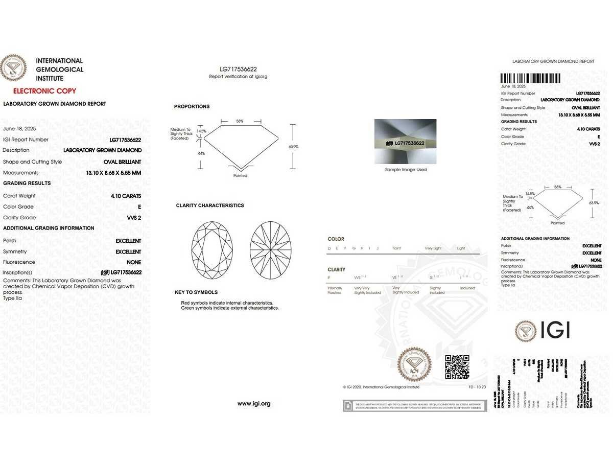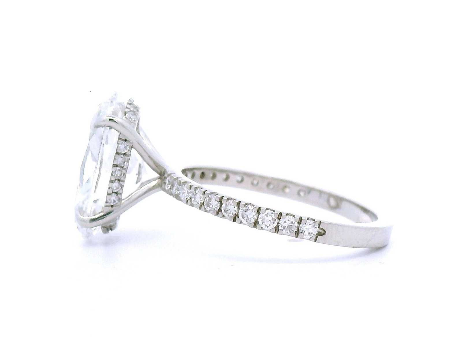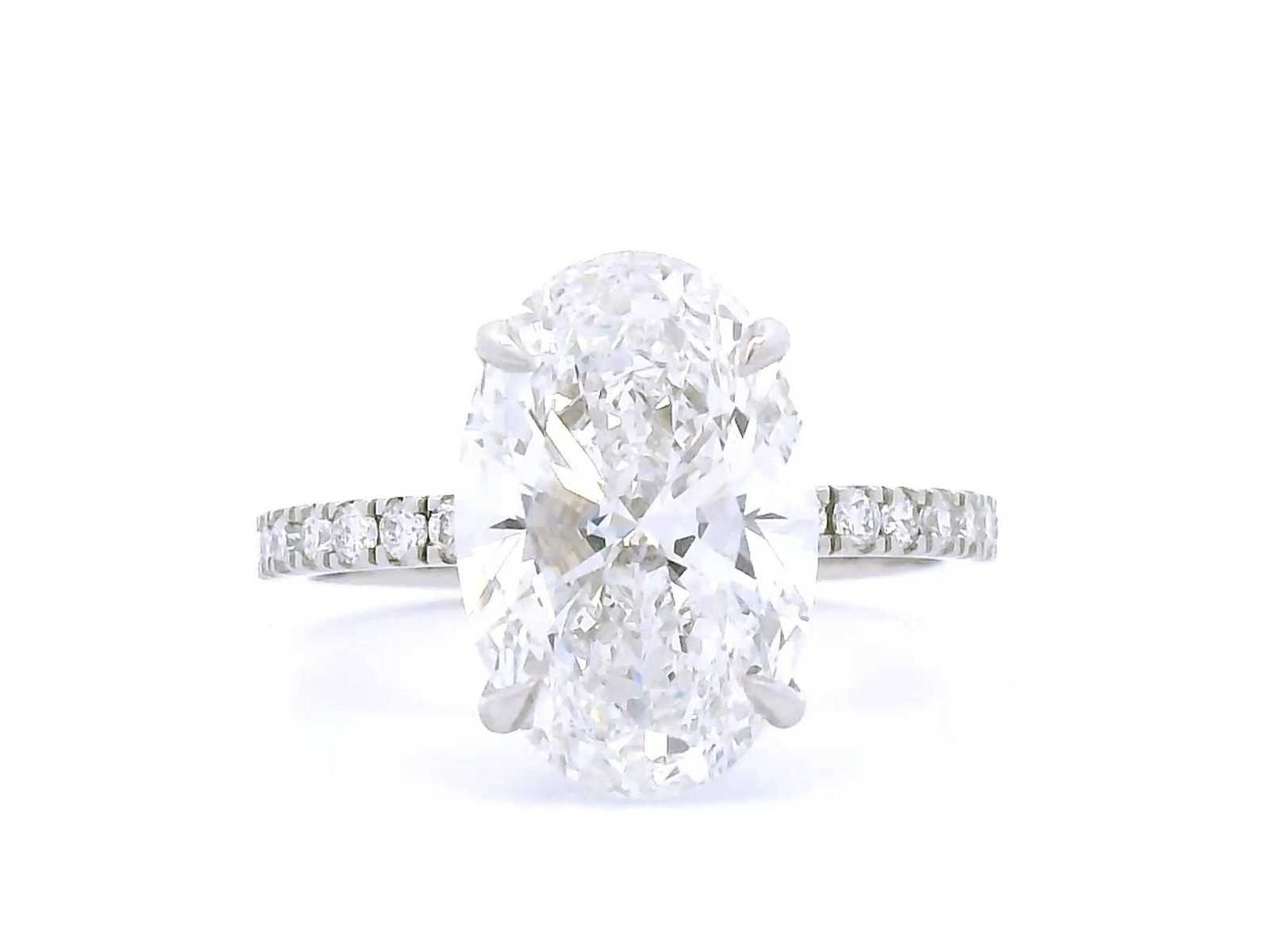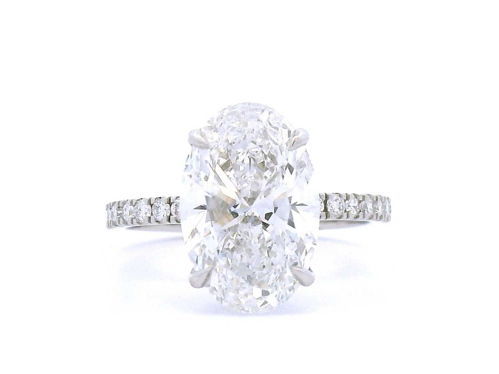 Exclusieve platina 950 ring Ringmaat - 54 EU / 14 IT / 6,75 US Rapportnummer IGI: LG717536622 Total Carat - 4.49 Carat Vorm: Ovaal Brilliant Karaatgewicht van de hoofdsteen: 4,10 Kleur: E Helderheid: VVS2 Symmetrie: uitstekend Omringende stenen - 0,39 (40 stuks) Totale ringgewicht: 4,24 gram Bezichtiging op afspraak Materiaal: Platina Ringmaat : 54 Certificaat: Ja Lage schatting: 6500€