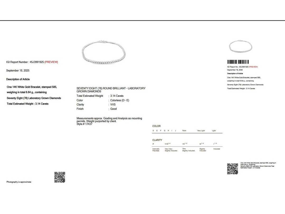 Geslepen: Rond Brilliant Karaat: 3,14 crt / 78 stenen Kleur: Kleurloos (D-E) Duidelijkheid: VVS Afmeting: 18 cm Bezichtiging op afspraak Materiaal: Witgoud Maten: 18 cm Certificaat: ja Lage schatting: 8900€