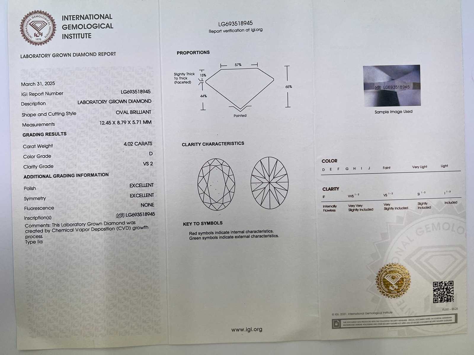 Vorm: ovaal Gewicht: 4,02 CT Kleur: D Helderheid: VS2 Symmetrie: uitstekend Fluorescentie: geen Zijstenen: 20 stuks, rond 0,17 ct Bezichtiging op afspraak. Materiaal: Witgoud Ringmaat : 54 Certificaat: Ja Lage schatting: 7400€