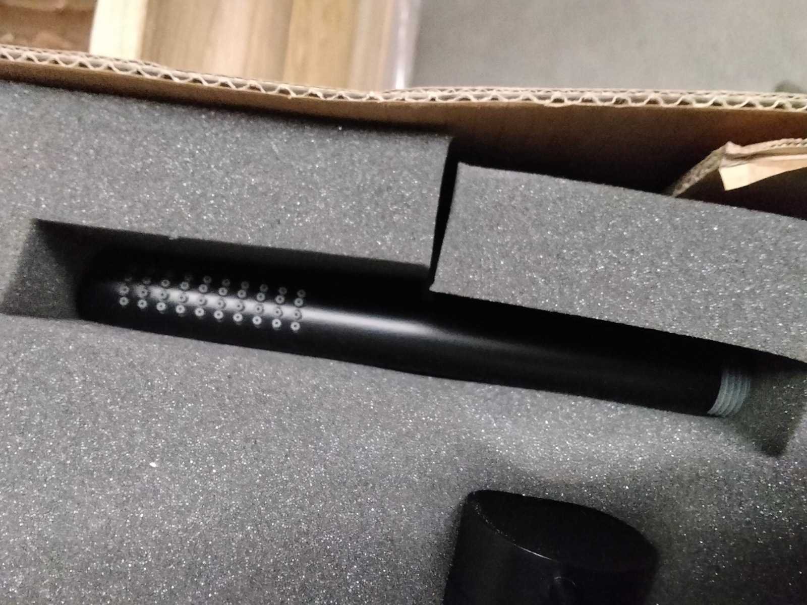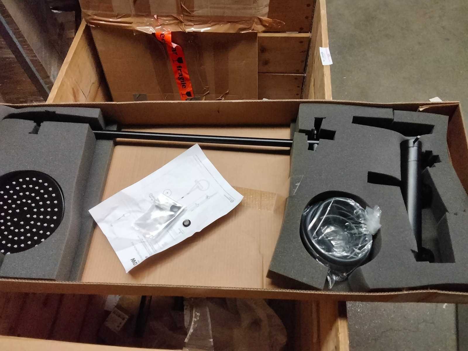Complete zwarte douche glijstangset met regendouche en handdouche.