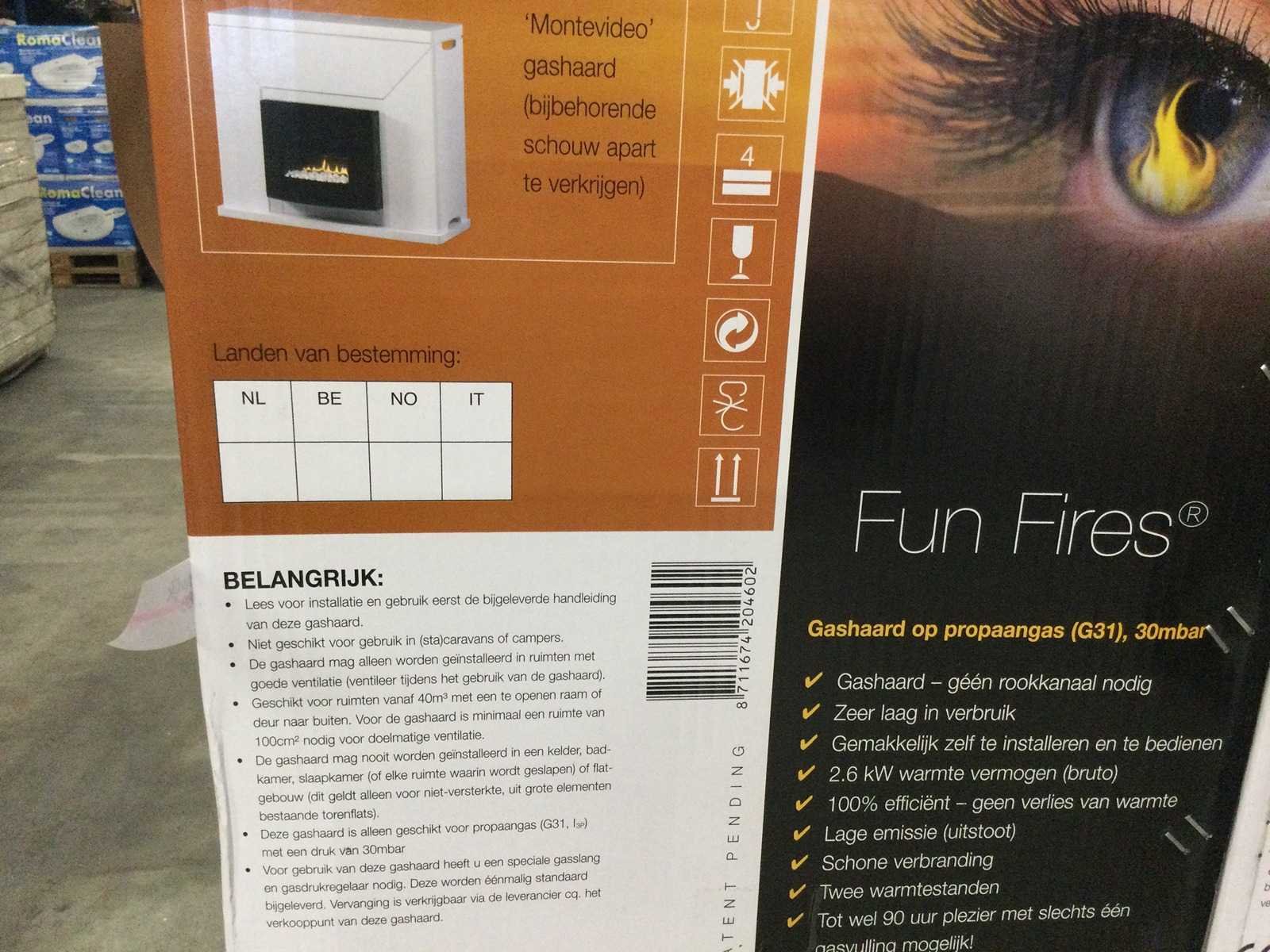 Set bestaat uit 2 dozen. Dus in totaal 8 dozen. Ombouw in doos is zwaar en groot.(133x103 cm). De Fleem productlijn biedt een gezelligheidsvuur dat zowel het interieur als tuin of terras voorziet van een warme levendige sfeer. Fleem biedt producten voor elk seizoen. Kies zelf voor een gezellige warme stijl of een moderne, strakke vormgeving. Veiligheid staat hoog in het vaandel en daarom garanderen wij dat de haarden voldoen aan de laatste veiligheidsvoorschriften. De Fleem gashaard Montevideo is een gas sfeerhaard op een gasfles dus het voordeel van een echt vlammenspel maar niet de last van het aansluiten op een vaste installatie. Deze gasfles wordt niet meegeleverd, benodigd propane, gas met een druk van 30mB (G-31). De haard heeft 2 warmte standen met hoog 2,6 kW en laag 1,6 kW Merk: Fun Fires Model: Montevideo Brandstof: Lpg gasfles Kleur: Wit/zwart Lengte: 53 Breedte: 131 Hoogte: 104,3