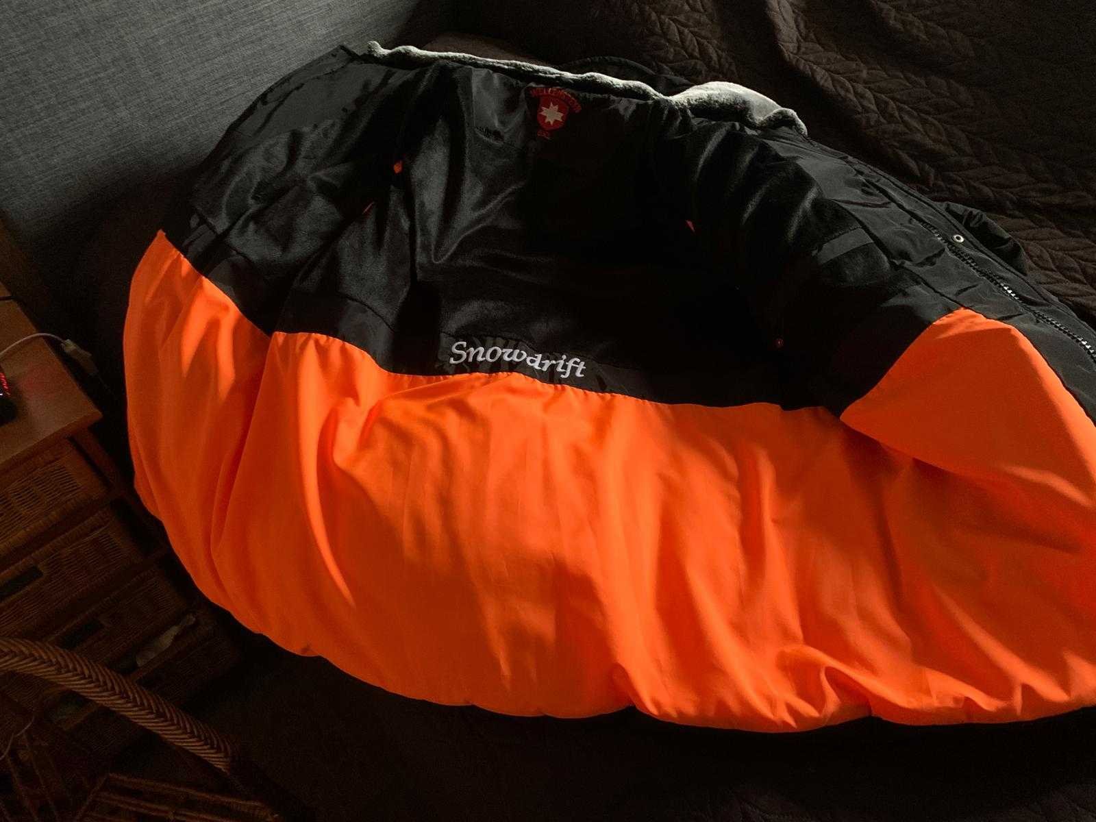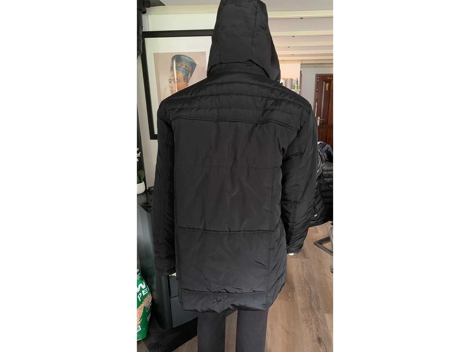 2 gewone zakken, 2 klep borstzakken met rits, 2 binnenzakken. Heren winter jas zwart maat 6 XL. Met capuchon. Jas is te passen op kijkdag. Maat: 6 XL Kleur: Zwart/oranje