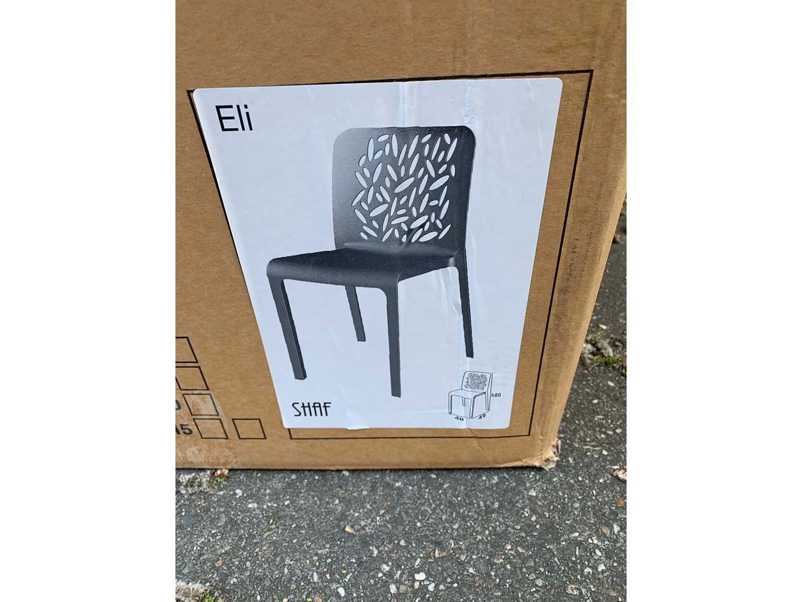 Zitten per 2 in een doos verpakt. 4 Dozen. Zowel voor binnen als buiten te gebruiken. Merk: Shaf Model: Eli Lengte: 49cm Breedte: 48cm Hoogte: 80cm Materiaal: Kunststof