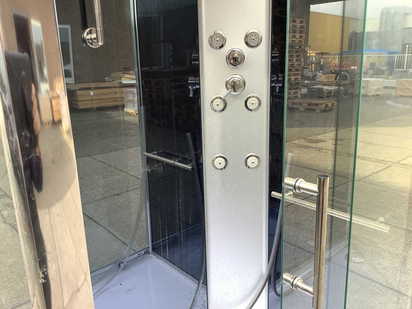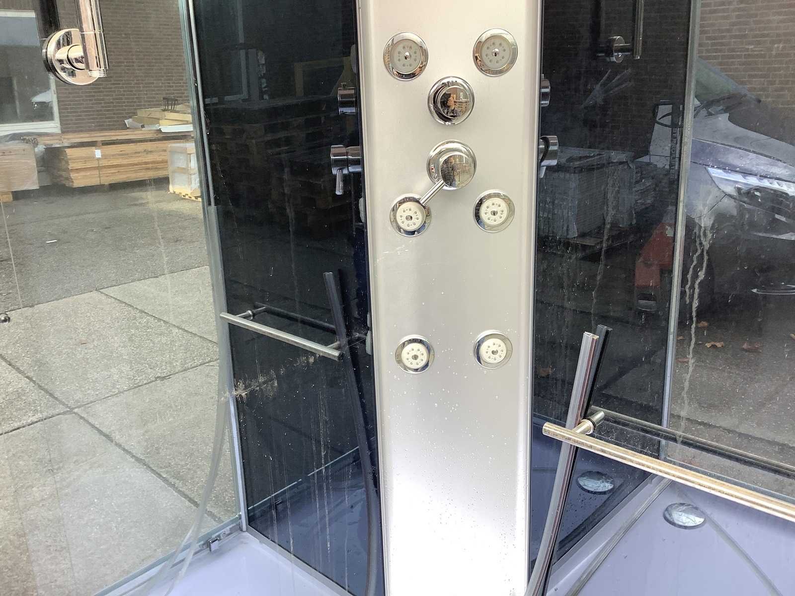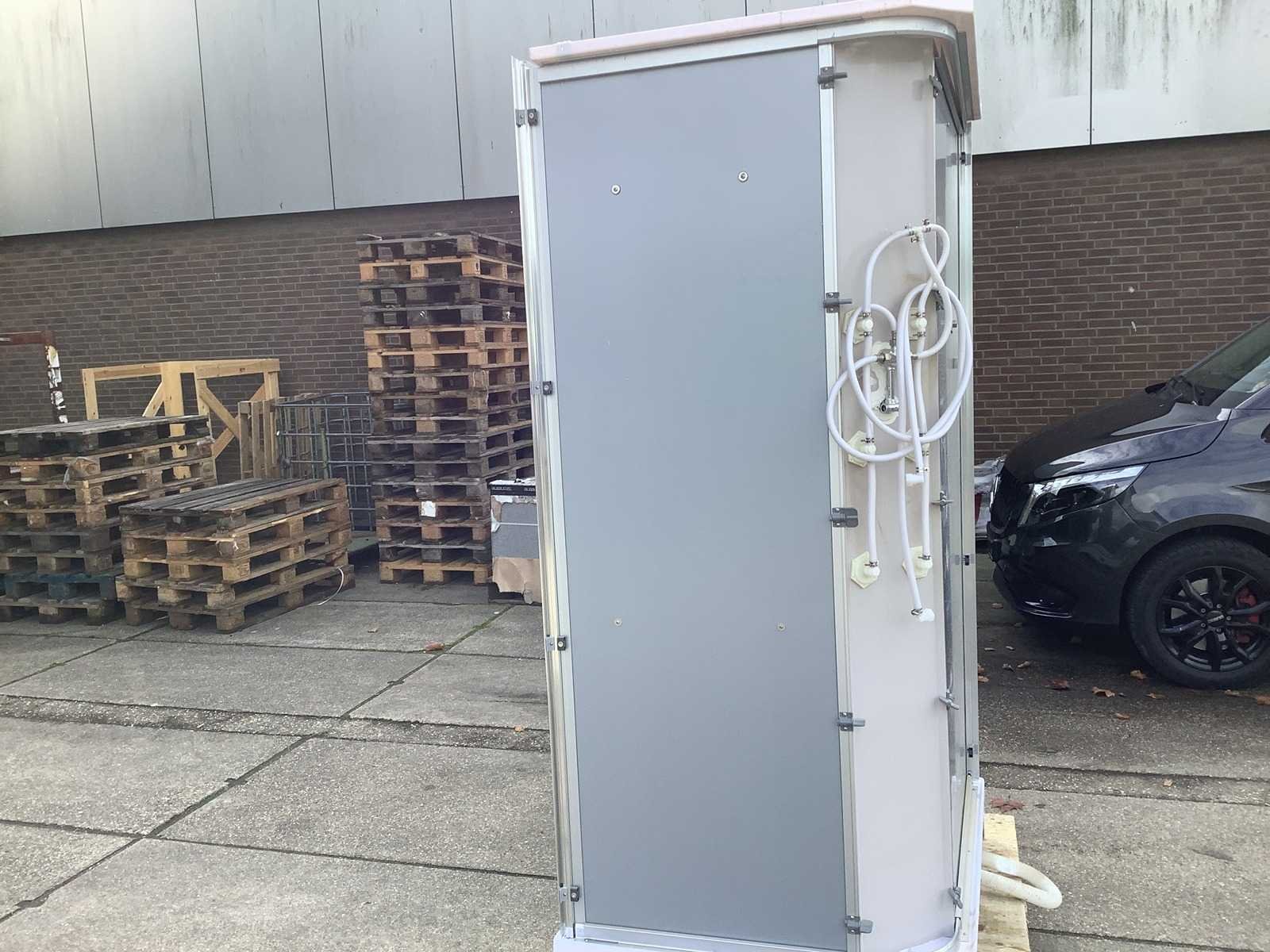 Ongecontroleerd. Afm. 117 cm breed, 90 cm diep en hoog 210 cm. Lengte: 90cm Breedte: 117cm Hoogte: 210cm Materiaal: Kunststof/glas