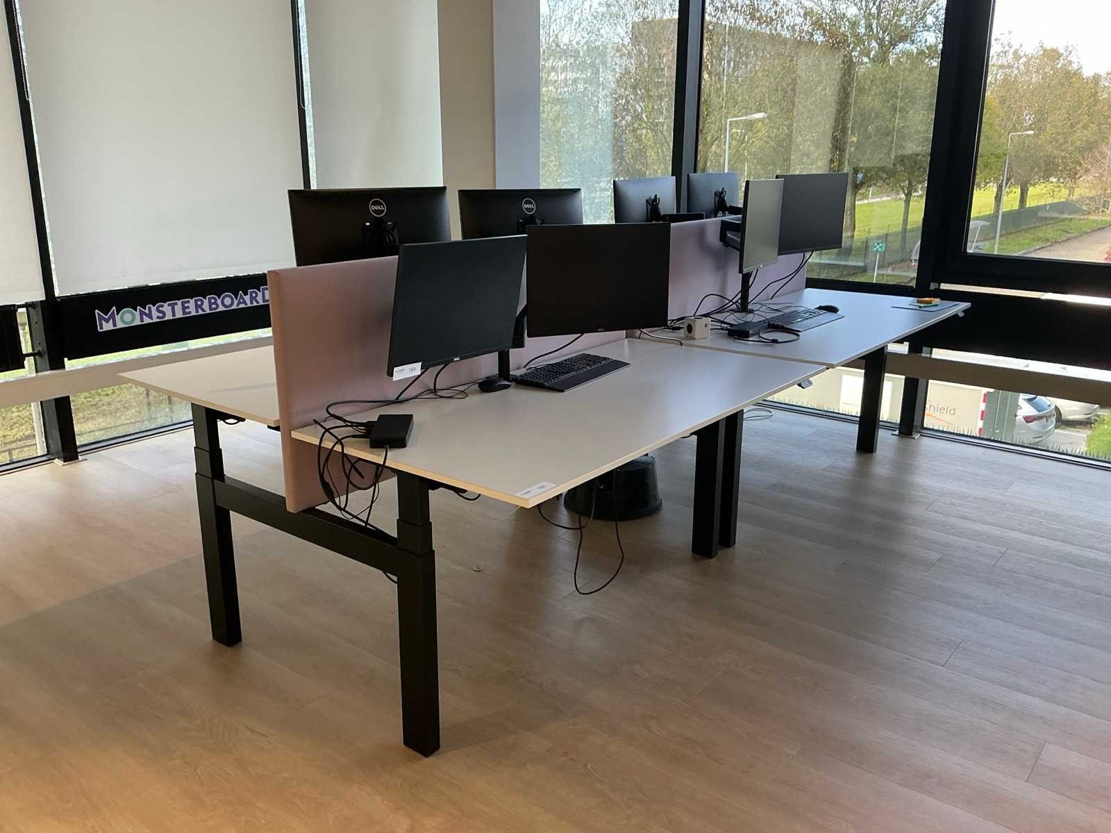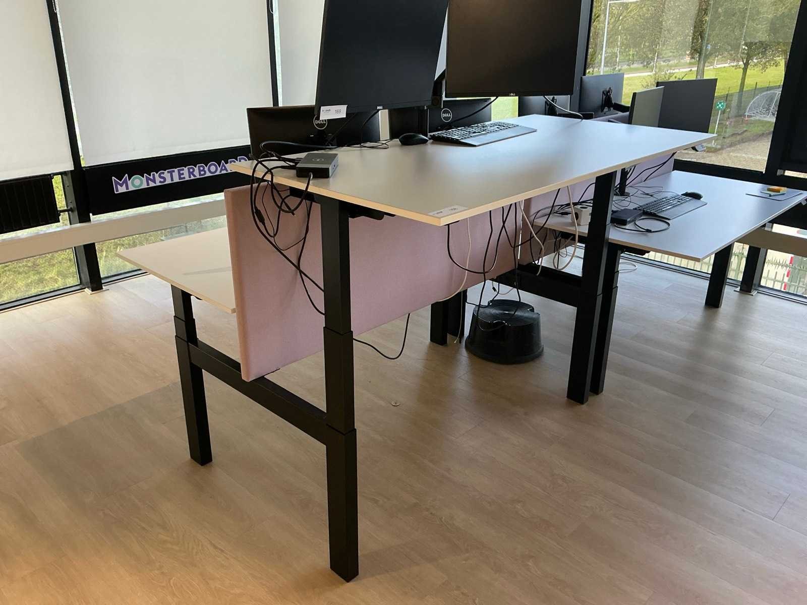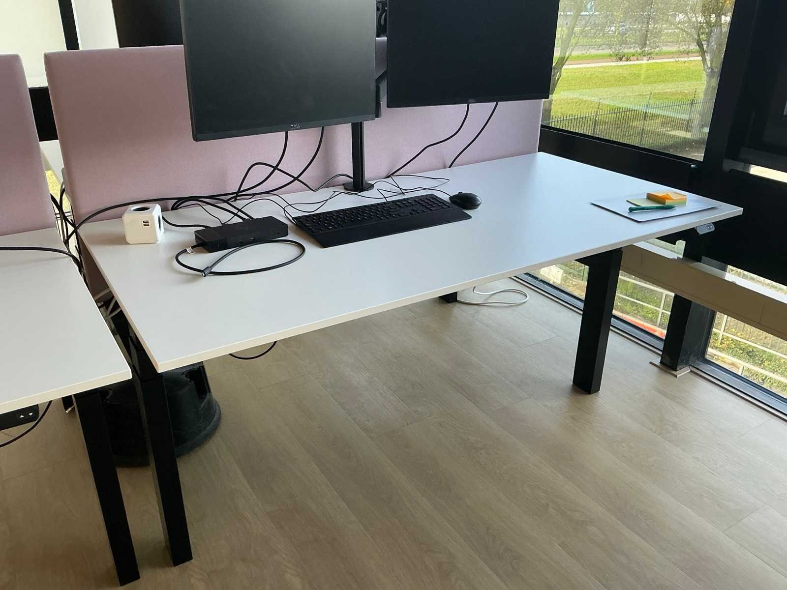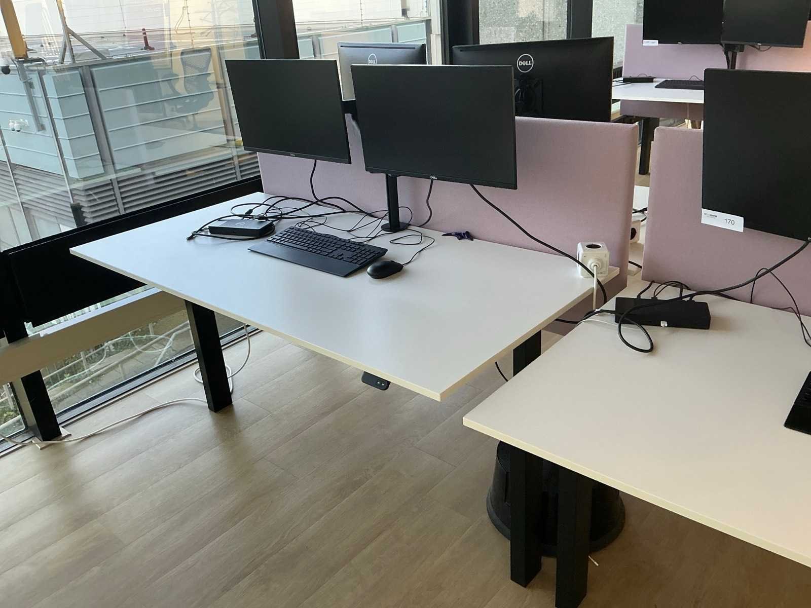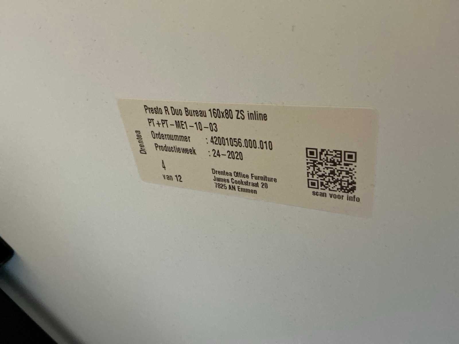 Kavel bestaat uit 2x Duo werkplek (160x80cm afmeting per bureau), elektrisch in hoogte verstelbaar tot 130cm hoogte, met tussenschot. Monitoren met beugels, keyboards en dockingstations niet inbegrepen. Merk: Drentea Type: Presto R zs inline Kleur: Wit Lengte: 160cm Breedte: 168cm Hoogte: 121cm