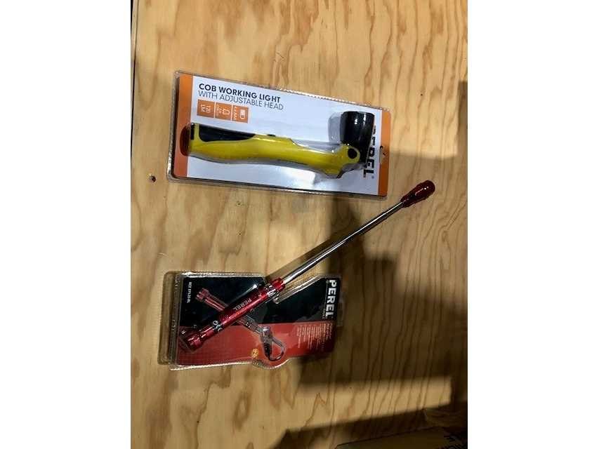 54 x Aluminium uitrekbare led zaklamp met oppikmagneet inclusief batterij 93 x Kunststof led zaklamp met verstelbare kop en 2 lichtbronnen. Voorzien van 2 magneten Merk: Perel Type: zak / werklampen