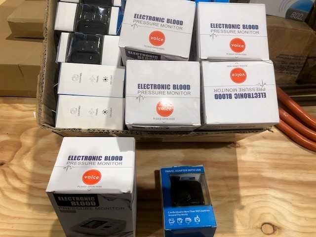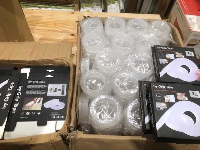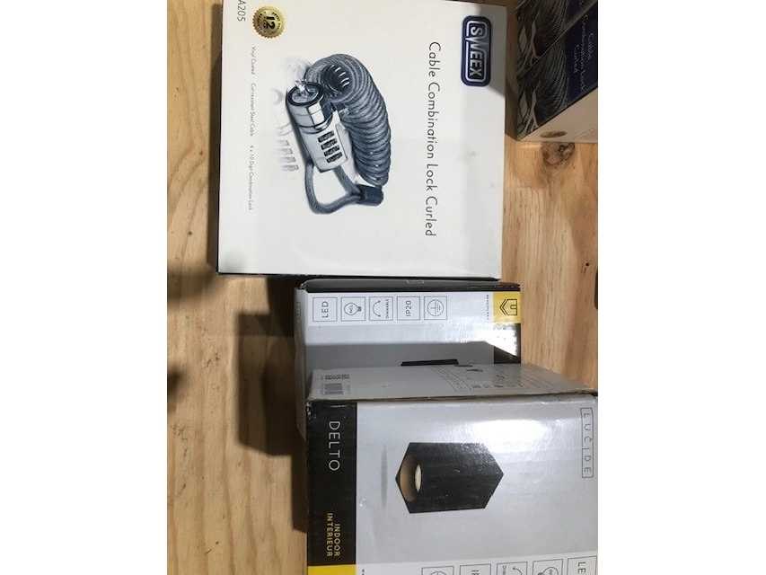 Bestaande uit o.a: circa 100 rollen Ivy Grip Nano tape Waskijpers, schuur en andere sponsen 2 x statafel kleed / rok circa 60 rvs pincet 13 x plantenspuit 2x gevarenbord voor auto of caravan rood wit 1x gietijzer pan (licht beschadigd) 1 x foto cube gebruikt 72x Schlosser hoekstopkraaan Anti vermoeidheidsmat Grote klok 80 cm Alberto LW collection zwart Camera systeem wireless Alarminstallatie 5 x bloeddrukmeters 23x wereld reisstekker 10x wak-up klok 11x wekkerradio 4x Sandvik boomzaag Metalen presentatie rek inclusief haken 2x maglite zaklampje 3x lucide spot metaal 21 x Sweex kabelslot