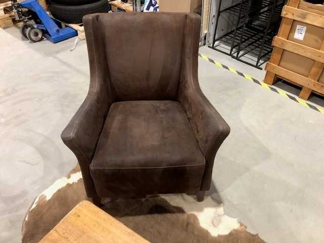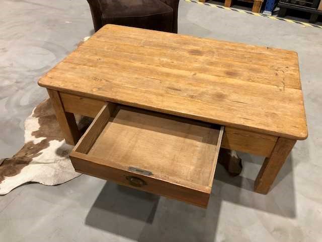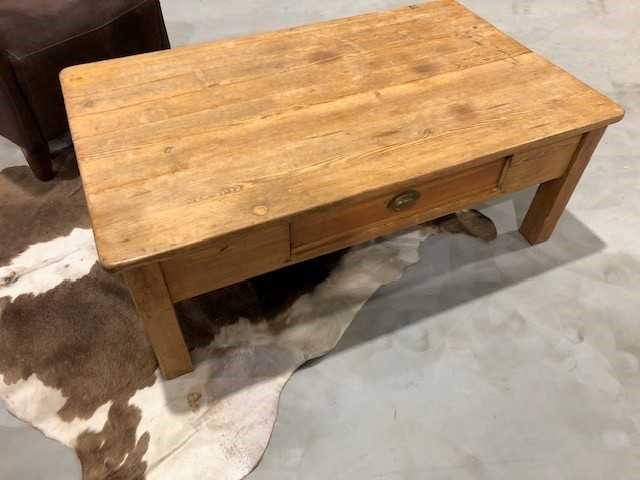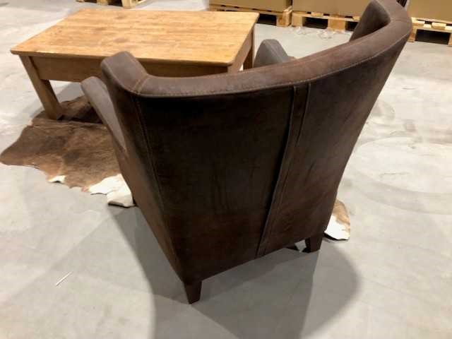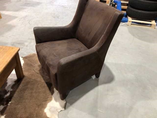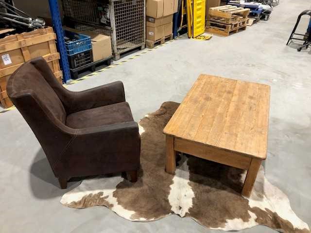 Bestaande uit 1 salontafel grenen hou circa 120 x 75 cm met lade, suede armstoel, vloerkleed