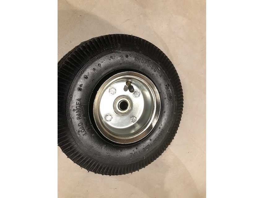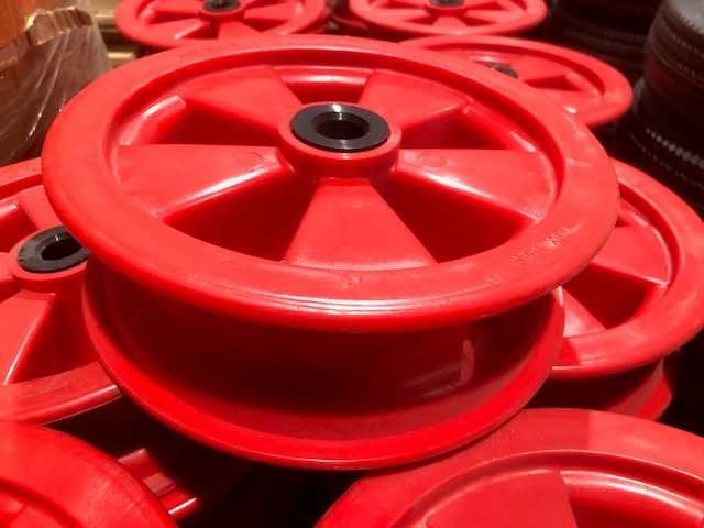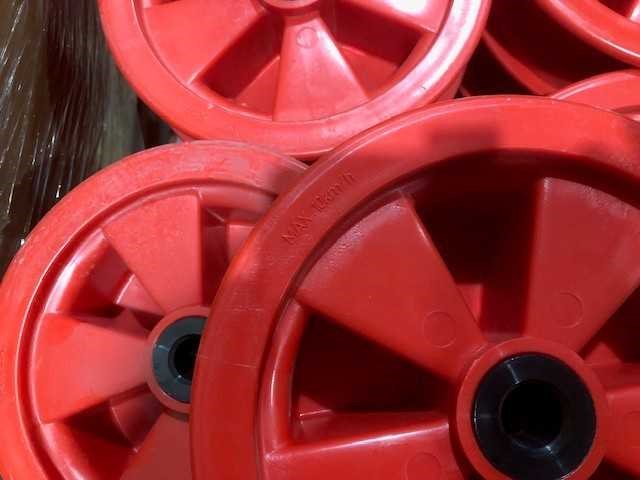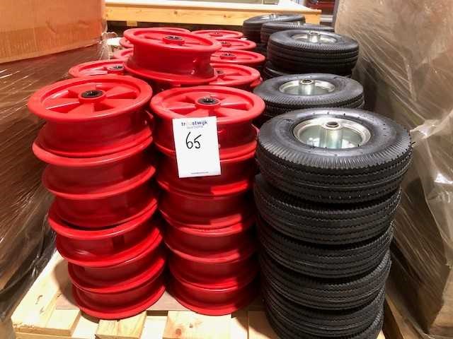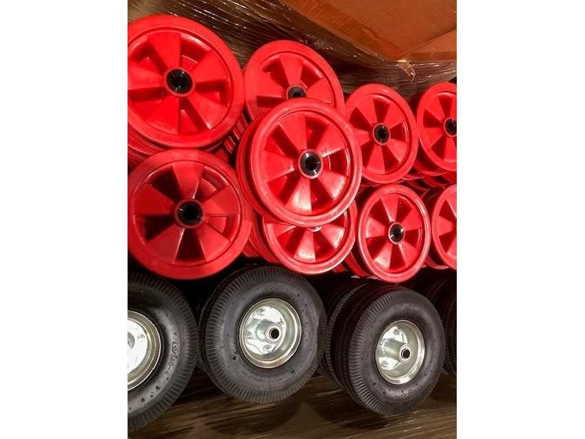 34 x luchtband op velg gemonteerd 260 mm x 80 mm. (circa) as 17 mm 62 x rode kunststofvelg voor o.a kruiwagenwiel 225 mm 75 mm as 20 mm.