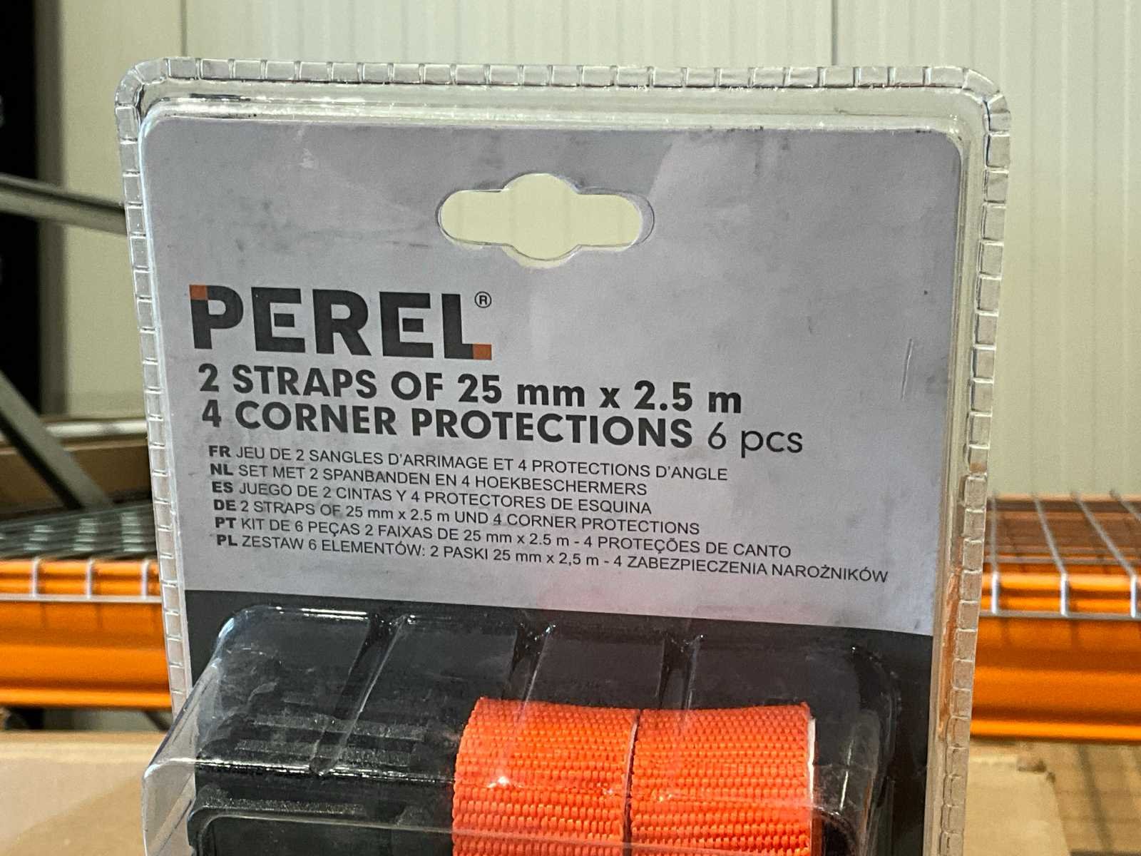 Bestaande uit 2 spanriemen breedte 25 mm, lengte 2500 mm; inclusief 6 stuks hoek beschermers; in blister verpakking; in doos. Merk: Perel