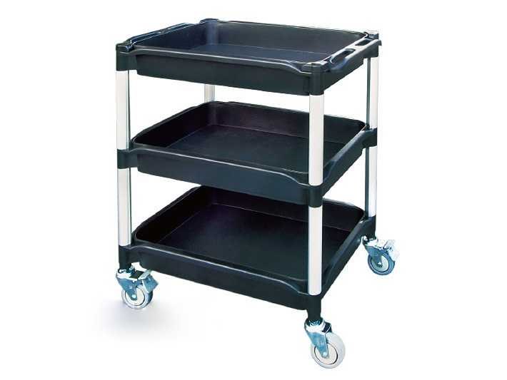 Etagewagen 608E met 3 legbakken zwart Comfortabele, wendbare en stijlvolle etagewagen met PP+fiberglas legbakken Gewicht: 13,7 Kg. (Inclusief doos 14,2 Kg) Draagvermogen: 200 Kg. Draagvermogen bovenste legbak: 50 Kg. Draavermogen onderste legbak: 150 Kg. 4 zwenkwielen waarvan 2 met rem Afmetingen: (LxBxH) 790x480x875mm Let op met 3 etages. Merk: Matador Model: bakwagen 3 etages Kleur: zwart Aantal etages: 3