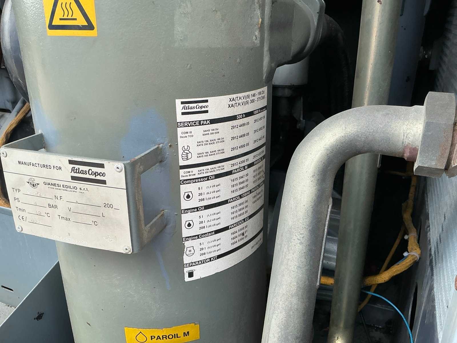 12 Bar, voorzien van Deutz TCD2013 LO4 2V dieselmotor, vermogen 104 kW Merk: Atlas copco Model: XAHS186DD Aantal assen: 1 Ledig gewicht: 1920kg Laadvermogen: 80kg Datum eerste toelating: 2009-04-29 Datum eerste toelating (NL): 2015-10-23 Kenteken: 35-WN-KV Nationaliteit documenten: Nederlands Zelf rijdend exporteren: Mogelijk